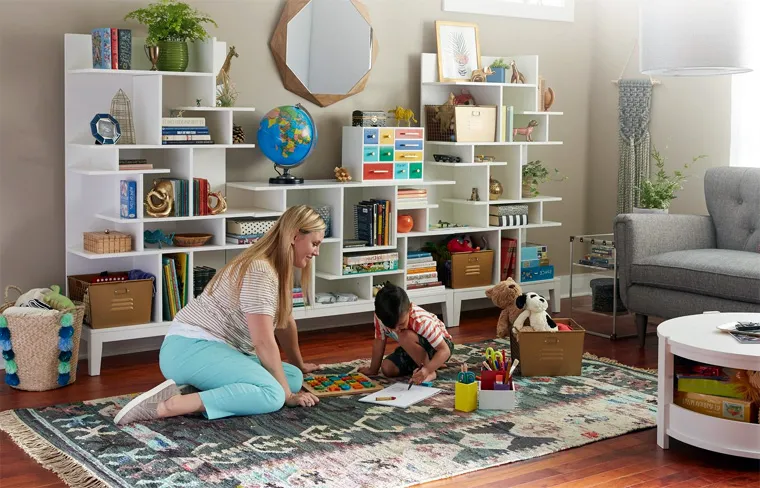 Самый простой стеллаж – это конструкция из прямоугольных коробов, которые можно расположить разноуровнево или из нескольких ярусов в одну линию. Располагаются непосредственно на полу или крепятся на стену. Модульность такого гарнитура позволяет выбрать размеры коробов: от невысоких для книг до больших квадратных с емкостями для заполнения. В качестве последних можно использовать прозрачные пластиковые короба, плетеные корзинки, обшитые тканью ящики, обращая при этом внимание на отсутствие острых углов, объемных ручек с целью избежать травмирования детских пальчиков. Добавит изюминки детскому интерьеру стеллаж в виде домика или шкафа с открытыми полками.