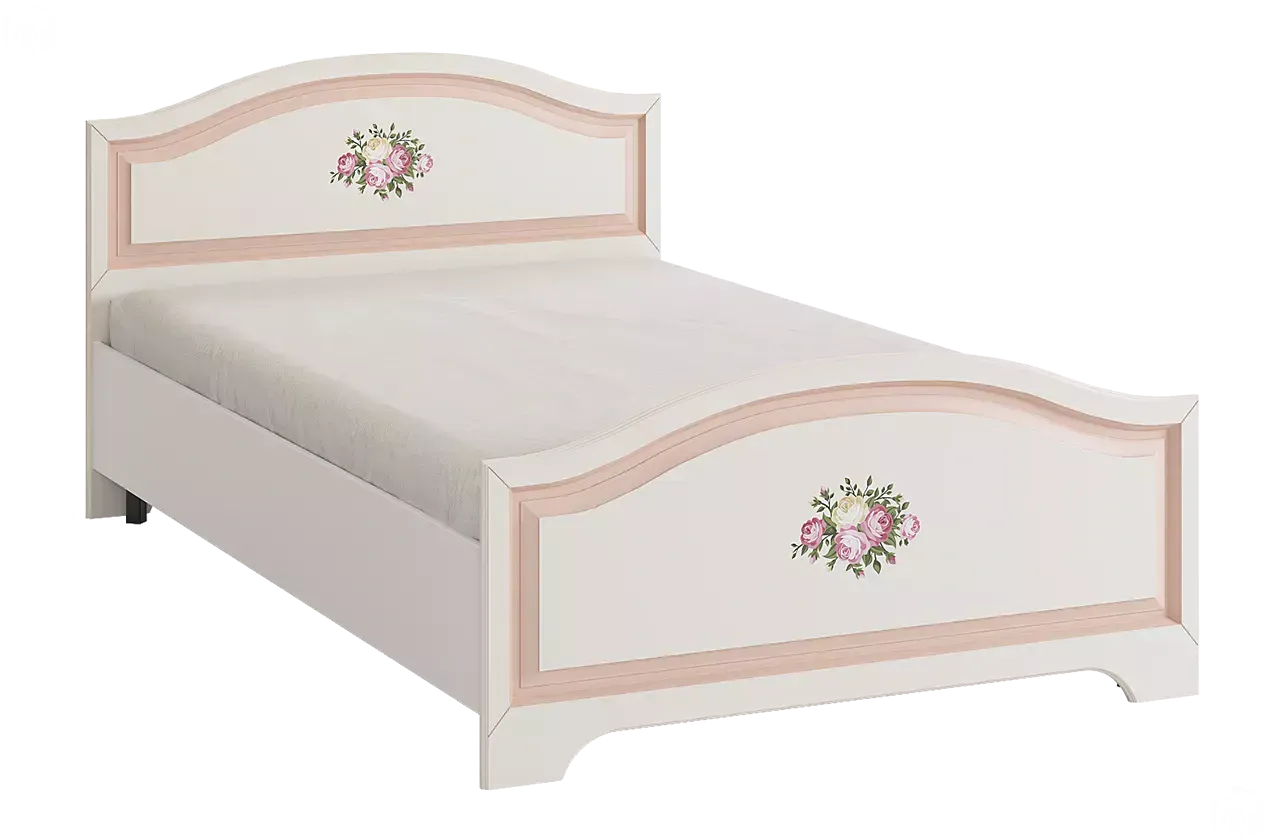 Кровать из серии «Алиса». Выполнена в нежных цветах: белый, крем и розовый. Спинка кровати выполнена из крашеного МДФ и украшена классической фрезеровкой с патиной и рисунком из роз. Кровать комплектуется основанием для сохранения здоровой осанки.
