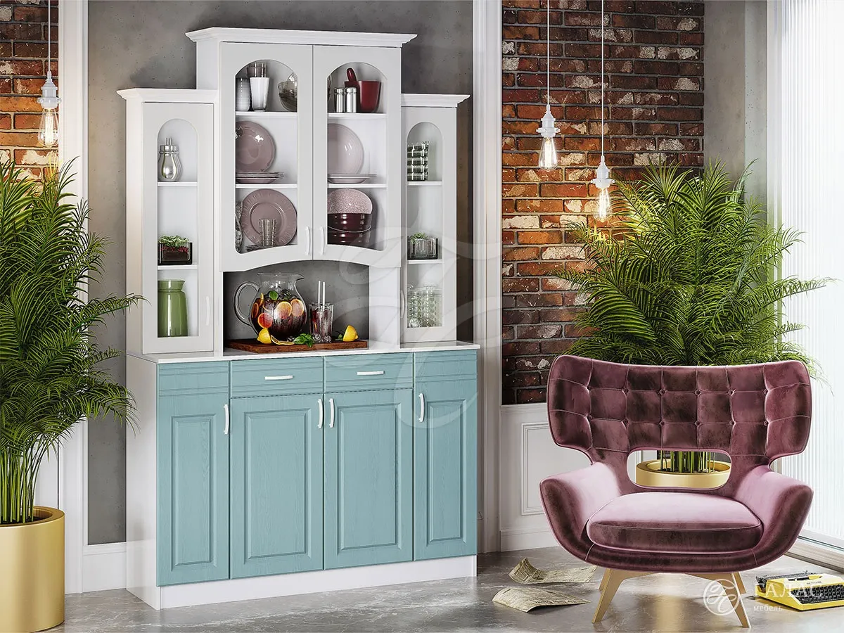 Буфет Констанция имеет классическое оформление, благодаря чему прекрасно впишется в любое интерьерное решение. Он состоит из нескольких вместительных отделений, позволяющих компактно разместить тарелки, сахарницы, чайники и многие другие предметы, которые могут пригодиться на кухне. Для дополнительного удобства в буфете предусмотрена широкая столешница, она может играть роль подставки для сервиза или использоваться в качестве рабочей поверхности. Буфет оформлен декоративным карнизом.