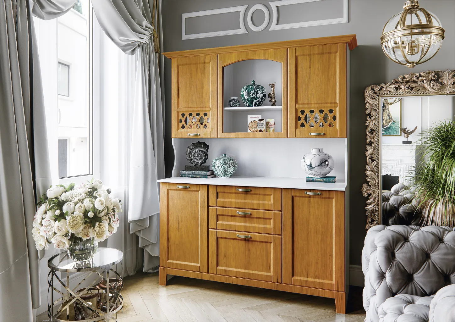 Большой и красивый буфет для кухни или дачи. Каркас выполнен из ЛДСП белого цвета, фасады МДФ Орех.