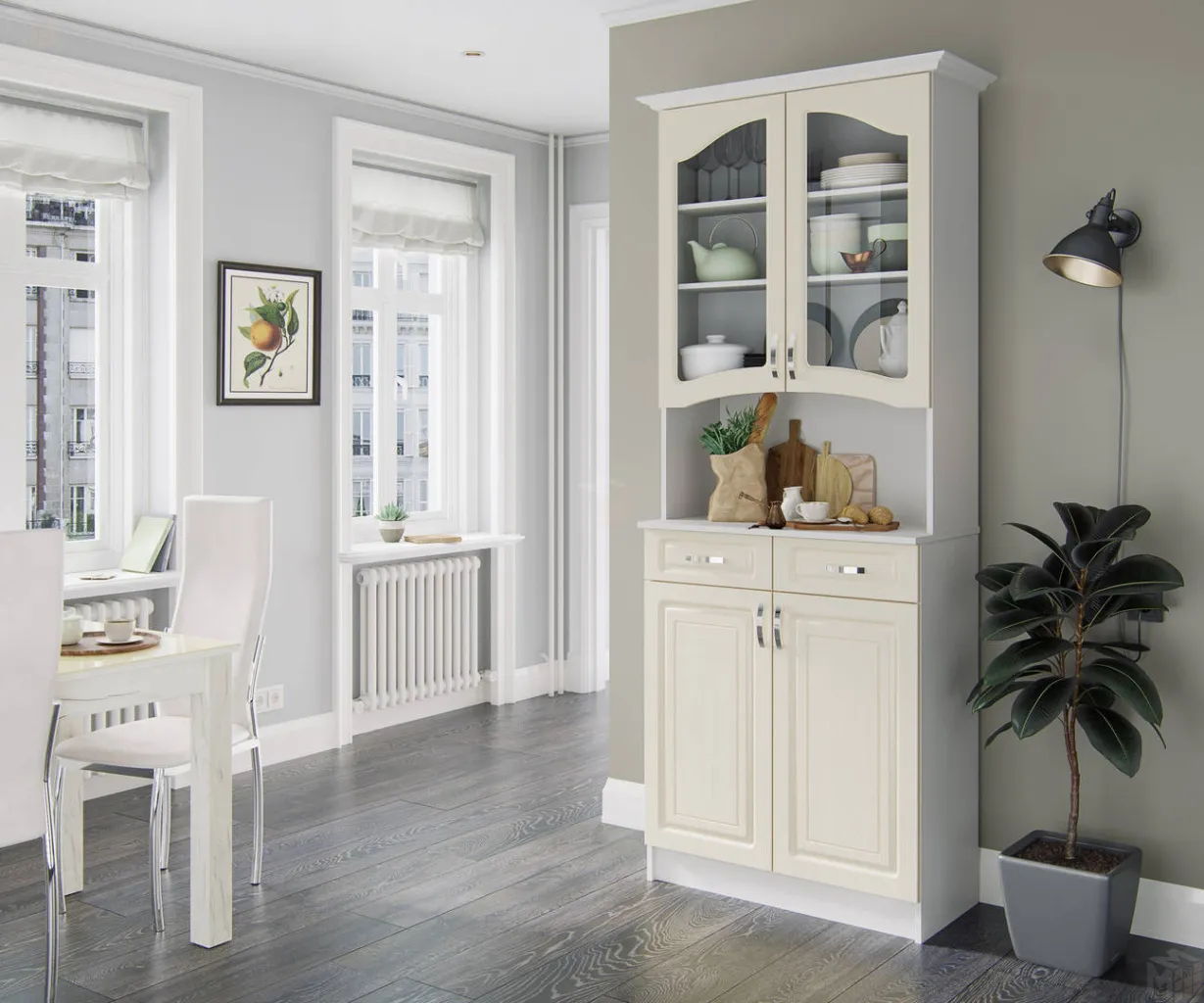 Буфет "Прованс-08" – идеальный вариант для классической кухни или гостиной. Модель имеет элегантный дизайн и выполняется в нежных расцветках, особую легкость и воздушность ей придают стеклянные фасады. Верхний шкафчик буфета укомплектован широкими полочками, на которых удобно размещать различную посуду. В нижней части конструкции предусмотрены выдвижные ящики и вместительная тумба, где можно скрыть от посторонних взглядов все лишние вещи. Дополнительную функциональность модели придает удобная столешница, которая может использоваться в качестве рабочей поверхности или играть роль подставки для декора. Буфет оформлен декоративным карнизом.