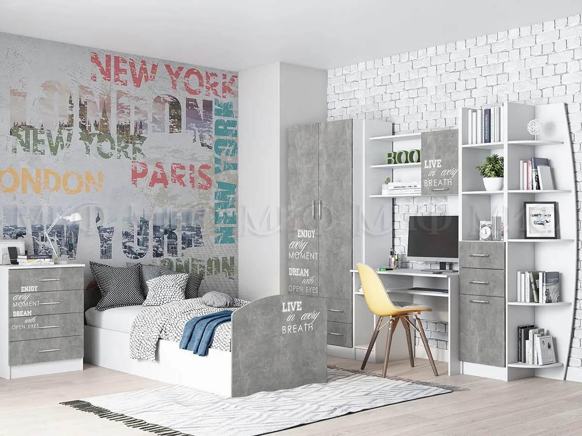 Юниор-2 Кровать ширина 840 мм, высота по спинке 650 мм, длина 2030. Размер спального места 80*200 см. Матрас приобретается дополнительно.Каркас мебели выполнен из ЛДСП Белый, фасады ЛДСП Бетон с фотопечатью.