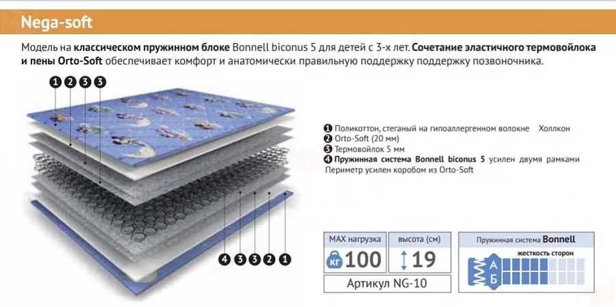 Модель на классическом блоке пружин Bonnel biconus 5 для детей с 3-х лет. Сочетание эластичного термовойлока и пены Orto-Soft обеспечивают комфорт и правильную поддержку позвоночника.