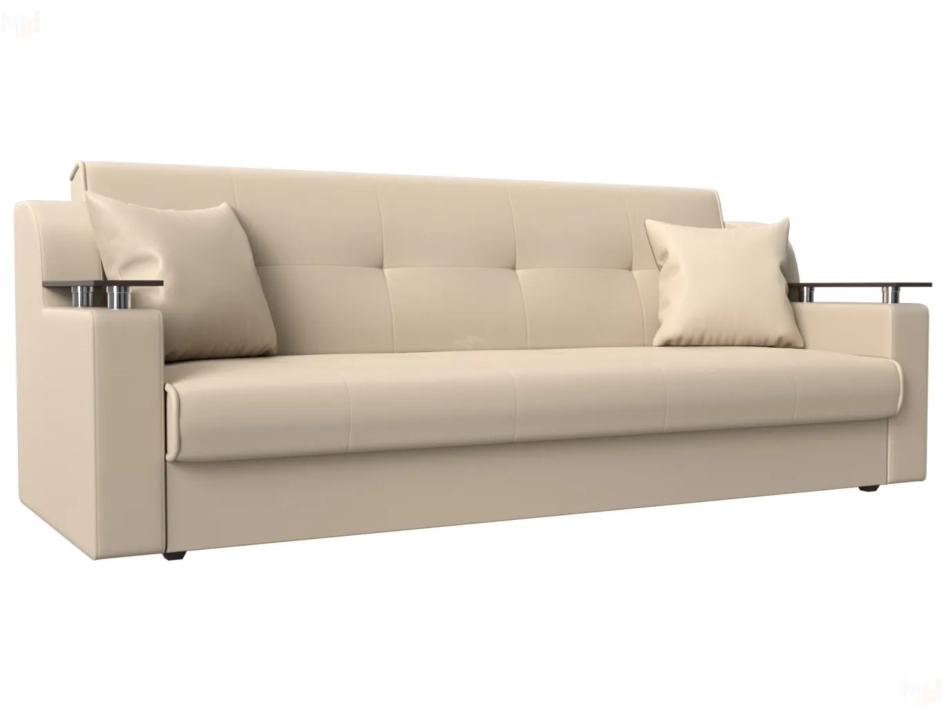 Сенатор – мягкий прямой диван с эргономичной спинкой и мини-столиками по бокам. Он устойчиво стоит на 4 пластиковых ножках, идеально гармонирующих с общим дизайном. Классический механизм «книжка» позволяет быстро трансформировать его в удобную двуспальную кровать.