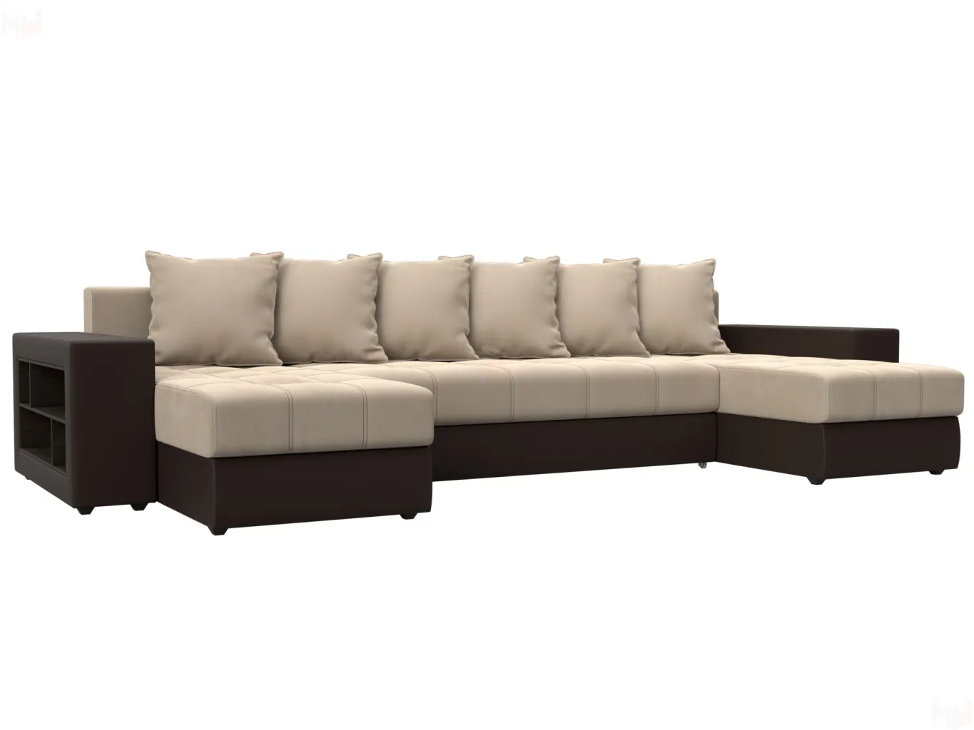 Большой п-образный диван Дубай универсален в использовании. Верх подлокотников – деревянные мини-столики. Сбоку имеются глубокие полочки для хранения предметов декора. Спинка состоит из 6 мягких подушек под цвет обивки.