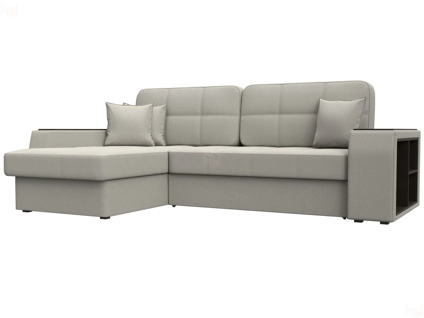Шикарный угловой диван Брюссель удобен и функционален в использовании. Подлокотники выполняют роль мини-столиков. Одна из боковин дополнена книжными полками, декорированным «под дерево». Под длинной боковиной расположена ниша для белья. Изделие оснащено удобным механизмом трансформации в двуспальную кровать. -