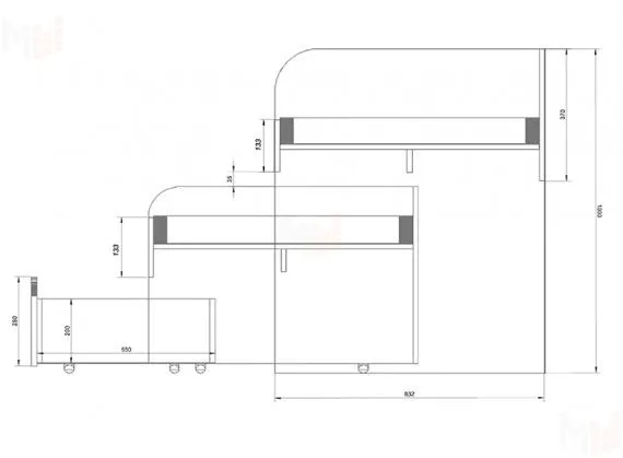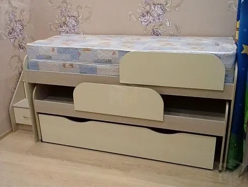 Под нижним спальным местом есть выдвижной ящик, в котором можно хранить белье, сезонные вещи или игрушки.