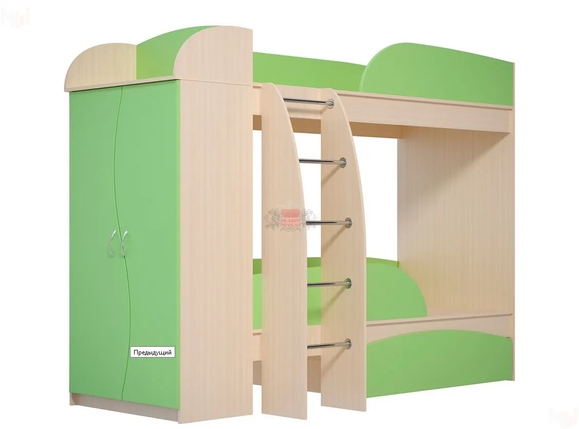 Два спальных места 800*1900 мм., выкатной ящик снизу, шкаф для платья и белья имеет отдел с полками и отдел с выдвижной штангой для верхней одежды.