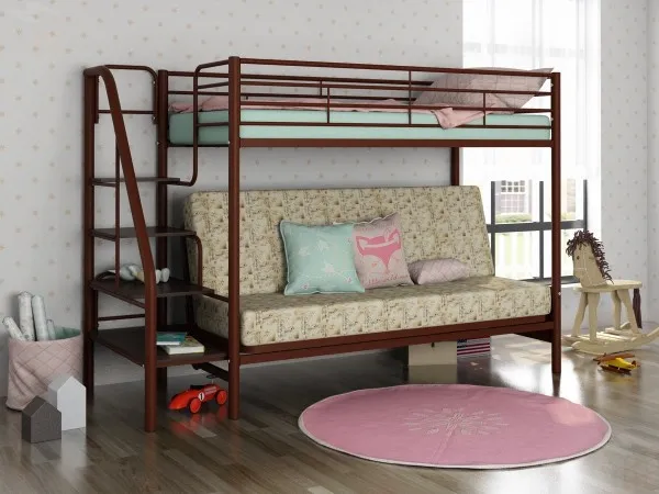 Модель Мадлен-3 двухъярусной кровати с раскладным диваном поставляется в коричневом цвете с декором гобелена дивана Марки темного цвета.