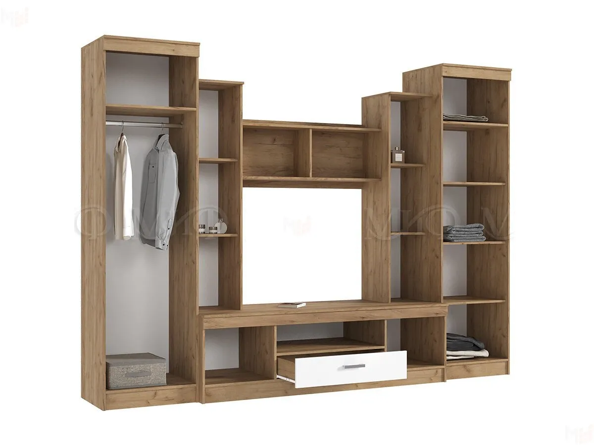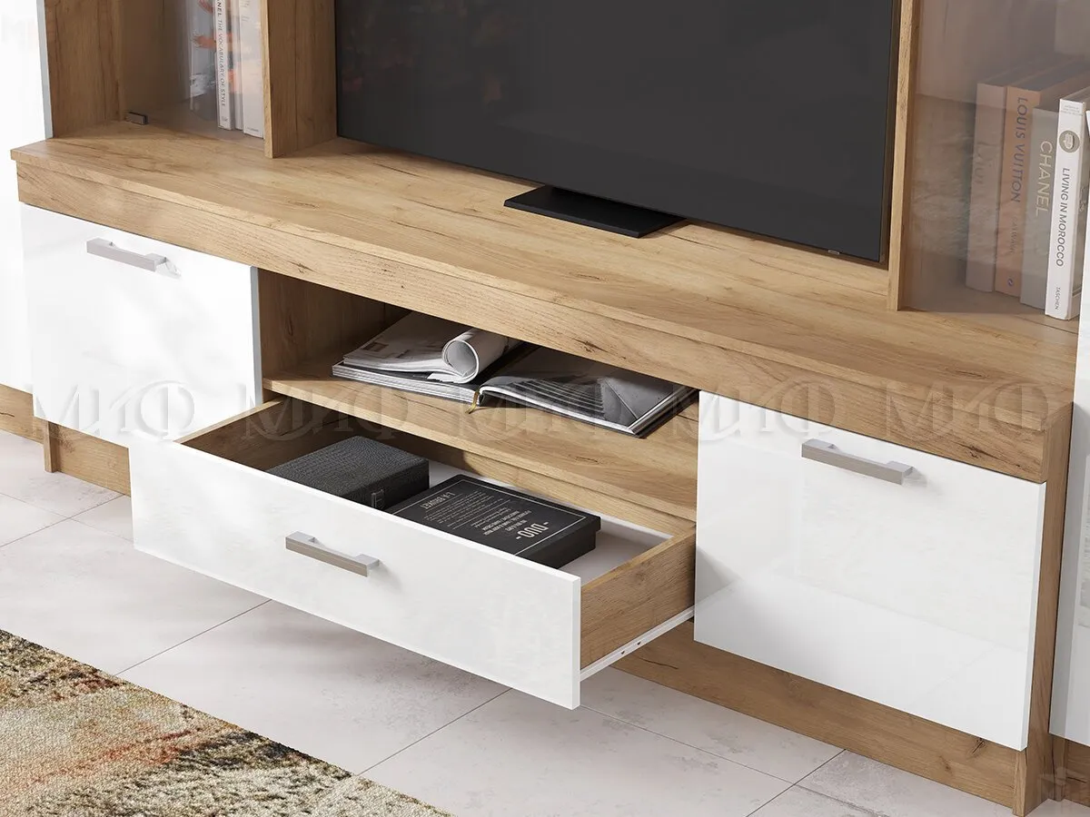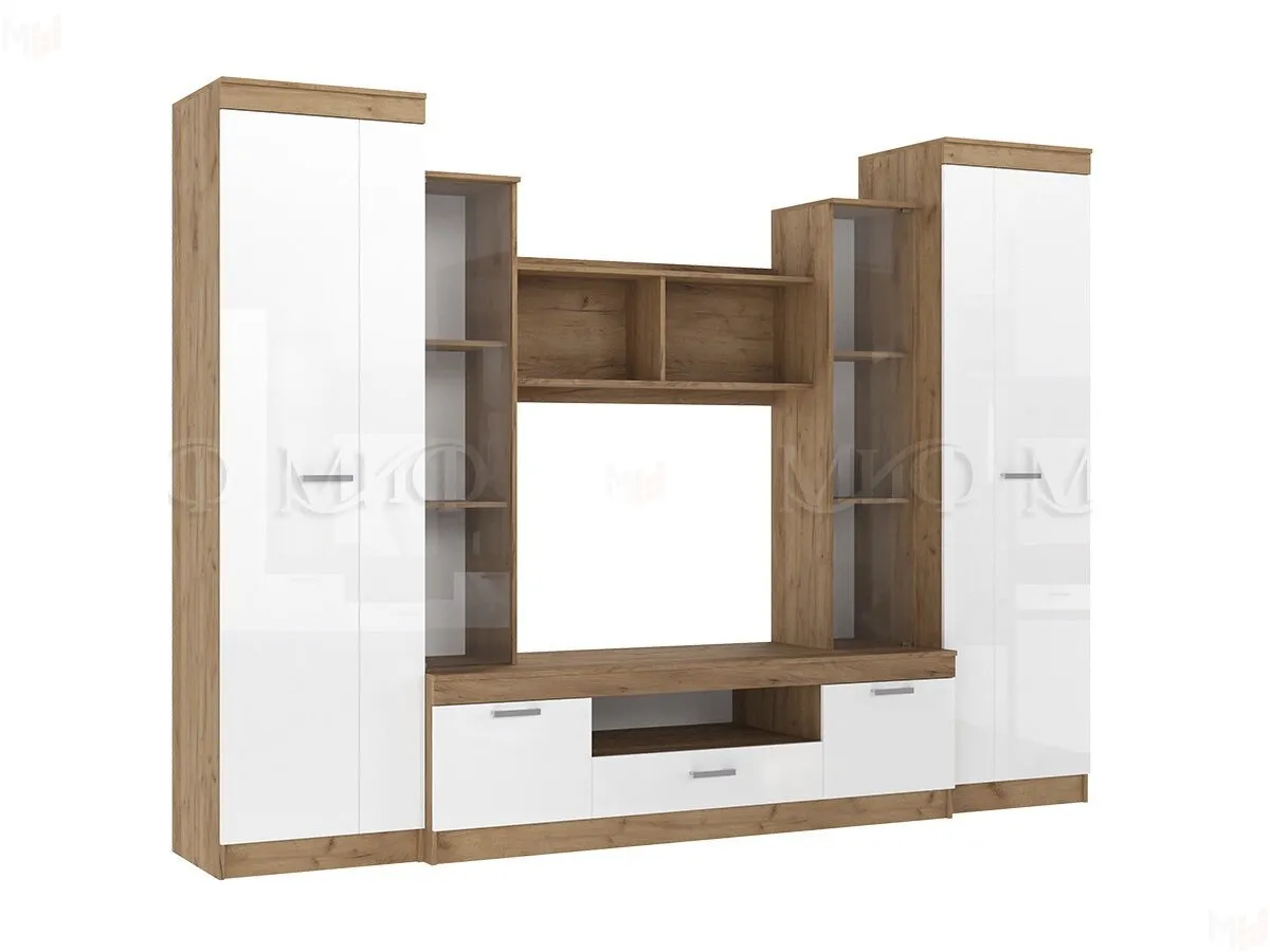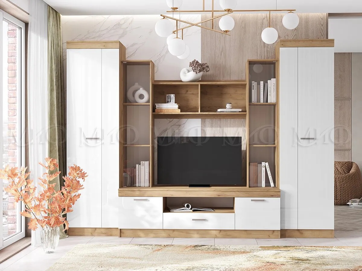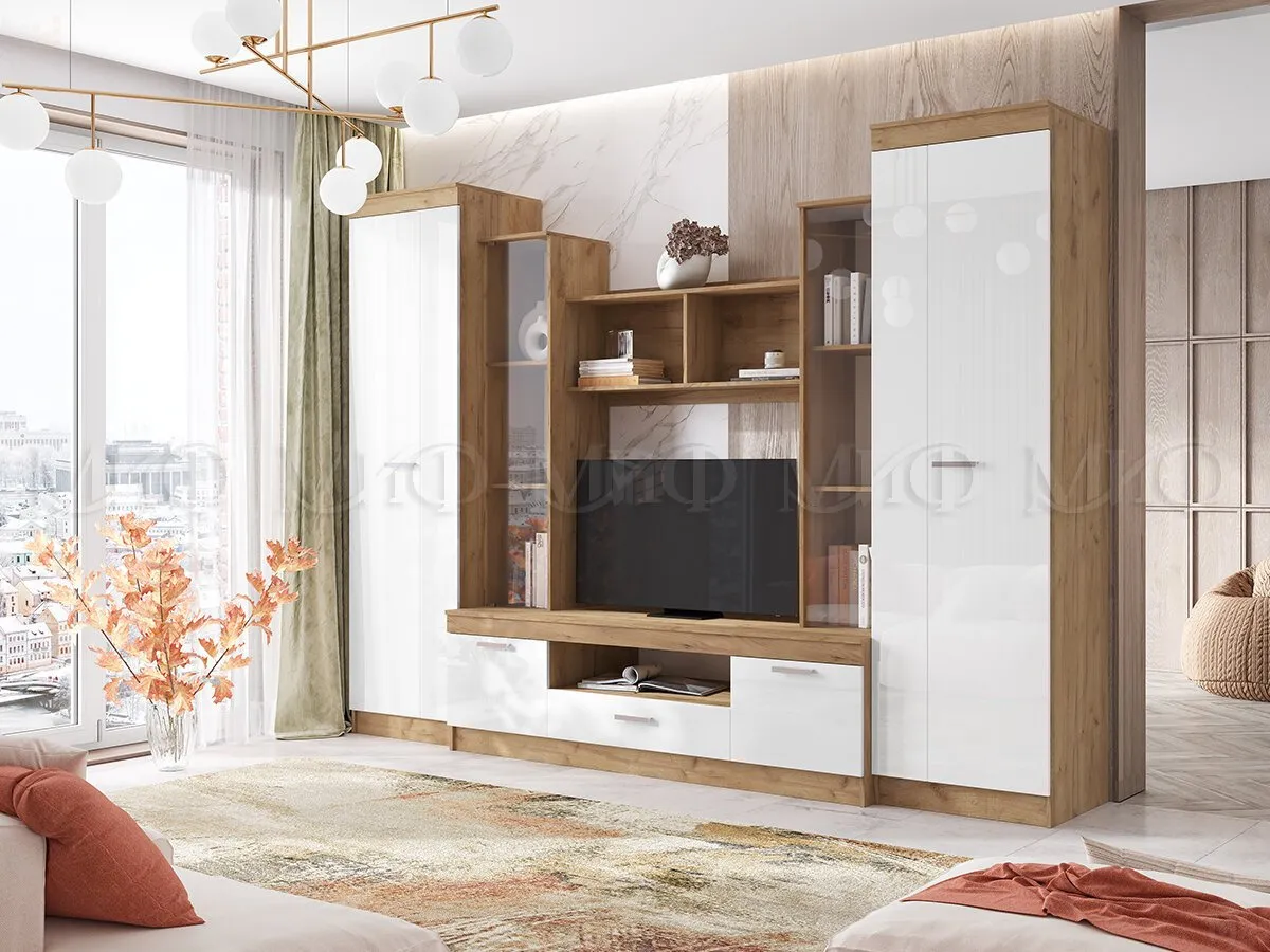 Гостиная выполнена в контрастном сочетании ЛДСП Дуб крафт золотой и Белый глянец.