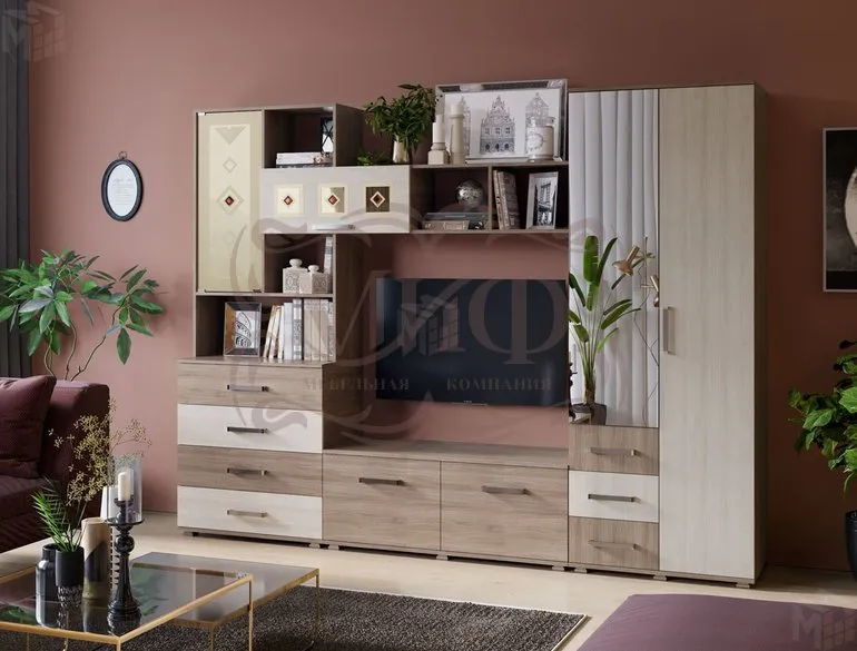 - центральная секция оснащена комодом, тумбой под ТВ, стеклостворкой под книги или посуду и полками под различные мелочи. Ниша ТВ 1184х1010 мм.