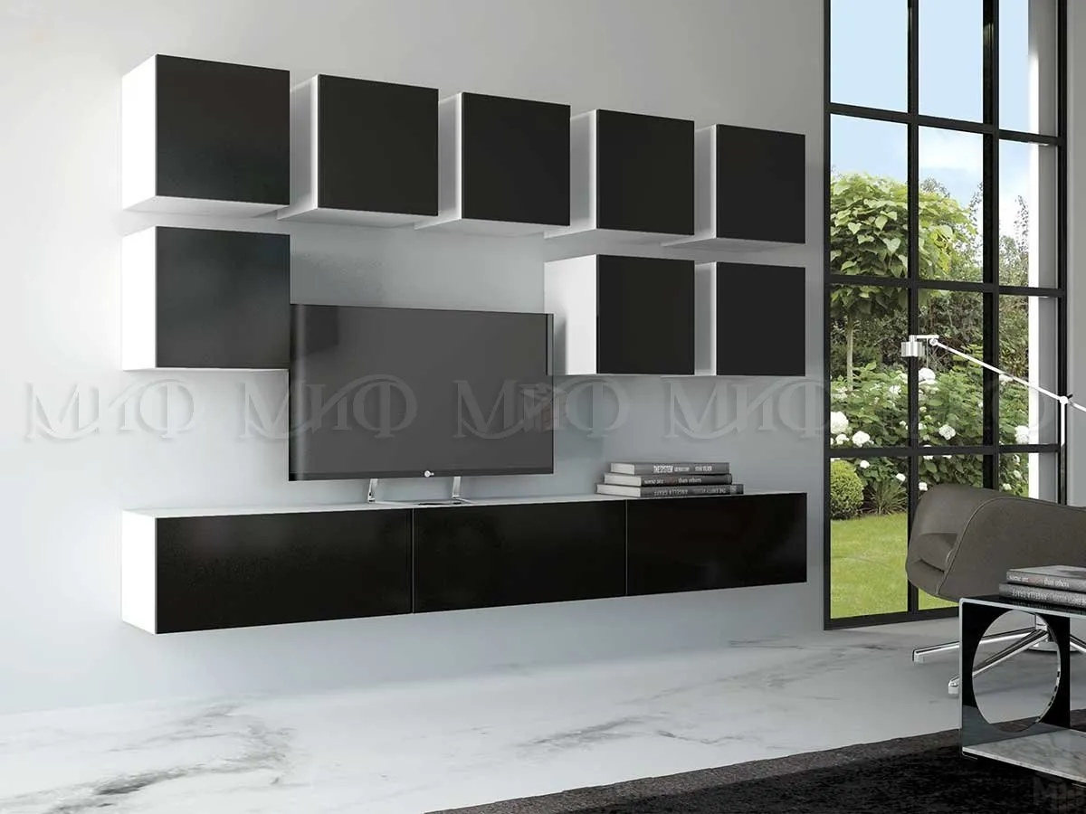 Корпус гостиной выполнен из ЛДСП, фасады МДФ Черный глянец.