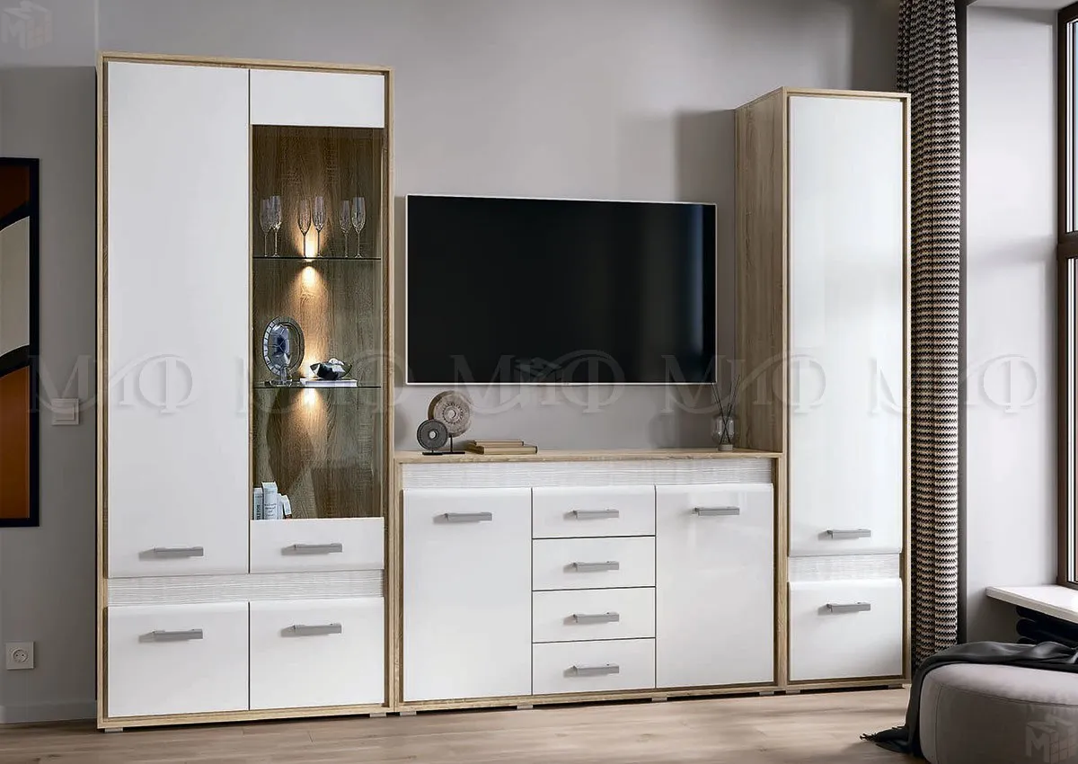 Приятным дополнением к спальне «Фортуна» является изящная гостиная с одноименным названием. Теплый древесный корпус гостиной украшен сияющим глянцем, зрительно расширяющим помещение. Сочетание палитры цветов удивительное и необыкновенное. Такая мебель не только украсит комнату, но и создаст уют и комфорт в вашем доме.