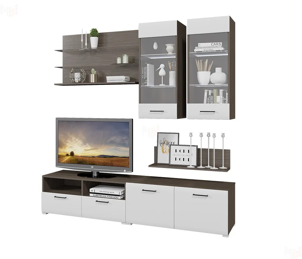 Современная горка для гостиной Ненси-3 может быть дополнена комодом, пеналом, шкафом для одежды или комодом. Набор состоит из ТВ тумбы, навесных витрин, навесных полочек.
