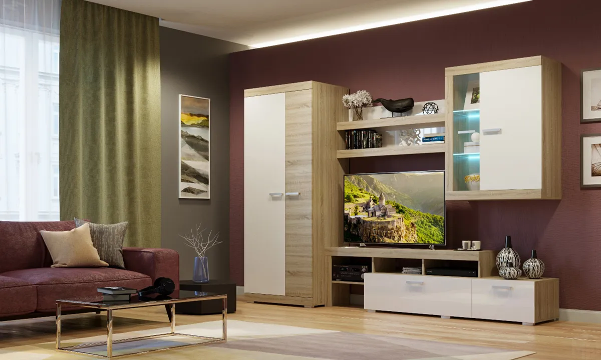 Цвет гостиной Дуб Сонома - Дуб Сакраменто, Дуб Крафт белый - Антрацит, Дуб Сонома - Белый глянец №1 -