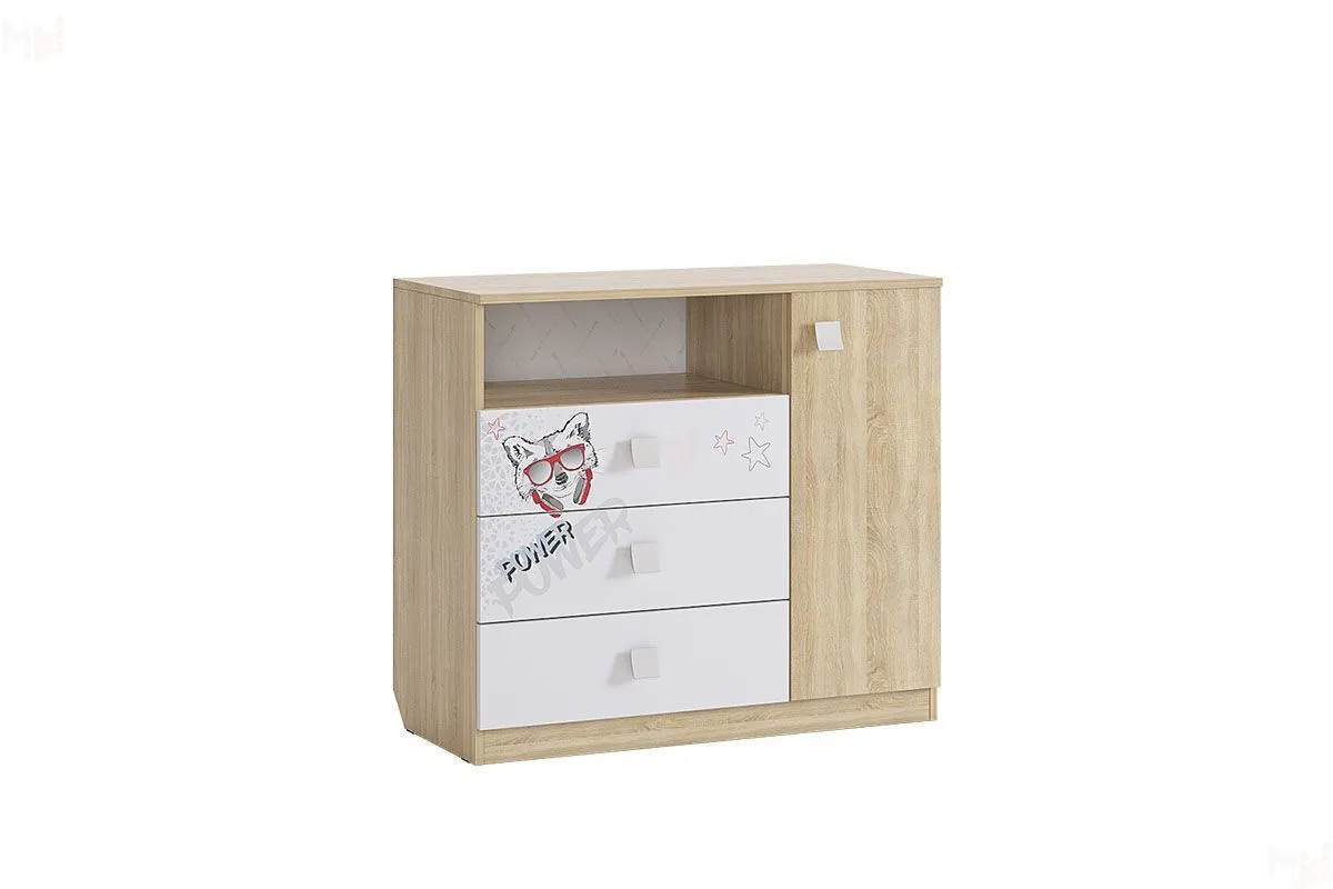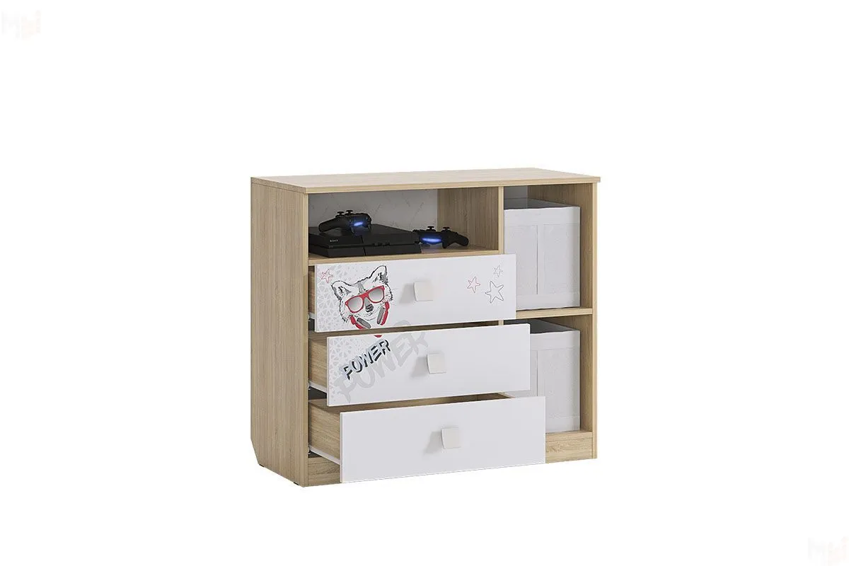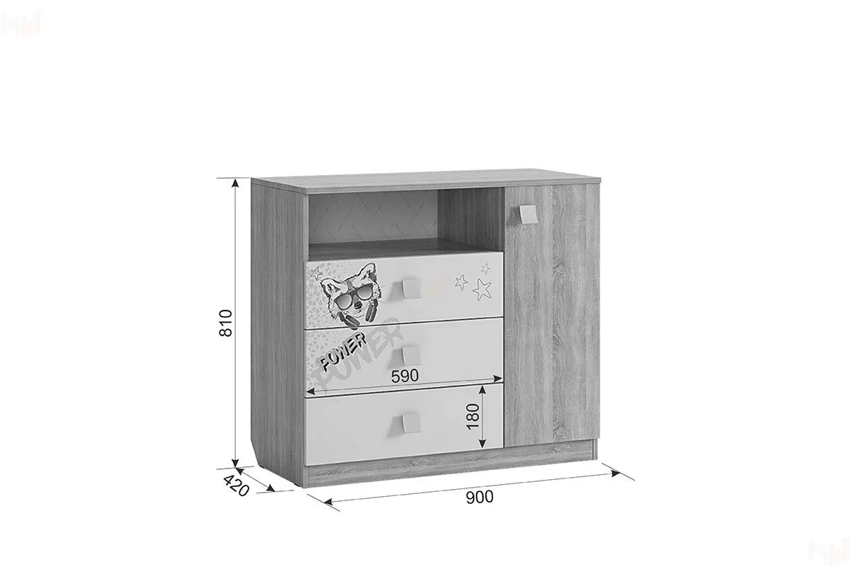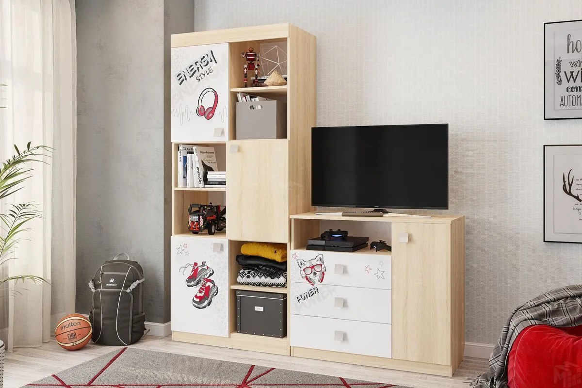3 выкатных ящика, ниша и закрытые полки, все что нужно что бы разместить вещи вашего ребенка. Эффектный принтерный рисунок на фасадах выдержан в общем стилистическом решении. Рисунок устойчив к истиранию и ультрафиолету. Открытая ниша для гаджетов, столешница толщиной 25мм, на которой с легкостью поместиться большой телевизор. -