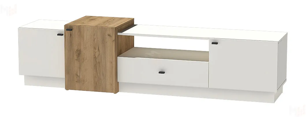 Оригинальная, современная тумба оснащена выдвижным ящиком на шариковых направляющих полного выдвижения и тремя дверками. -