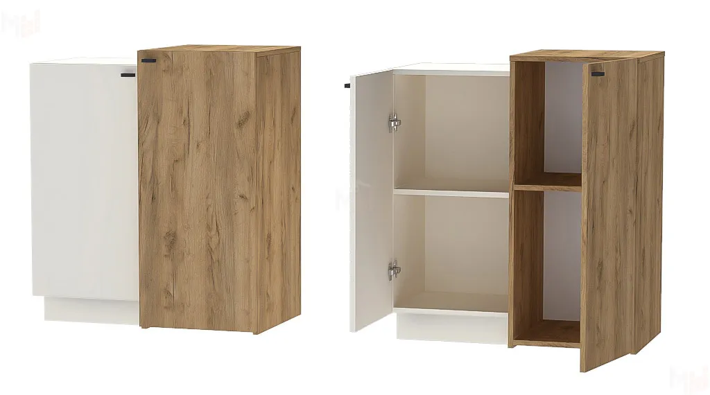 Двухуровневый комод оснащен двумя дверками с петлями с доводчиками.