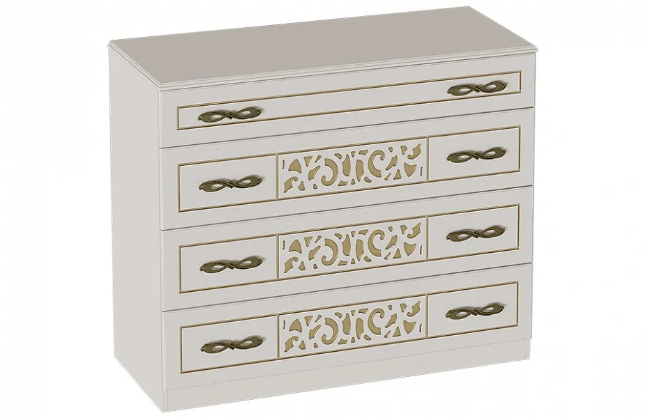 Спальный гарнитур «Оливия» выполнен в неоклассическом стиле. По-настоящему роскошной спальню делают оригинальная ажурная фрезеровка, оттенённая патиной «золото» и бронзовые ручки-вензеля. Тёплый цвет фасадов «ясень жемчужный» создаст в спальне атмосферу уюта и спокойствия.