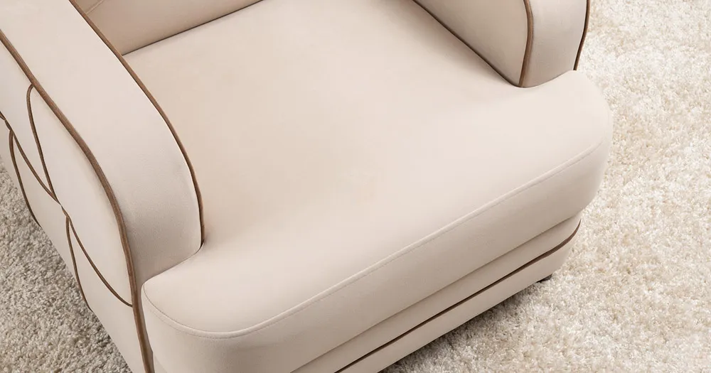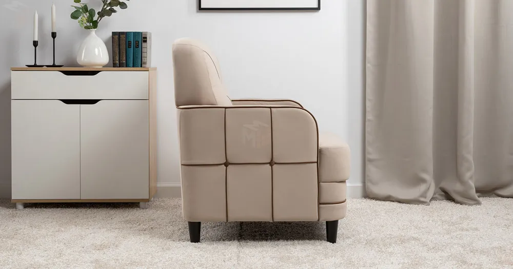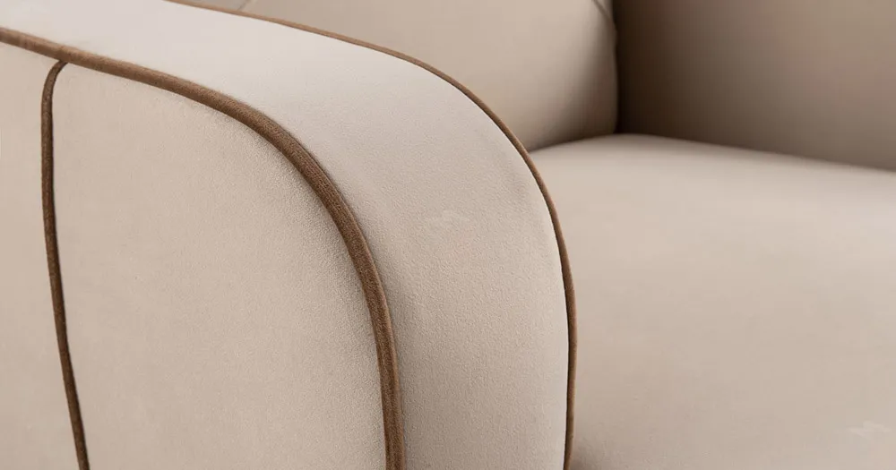 Декоративные канты на вставке подлокотников. Пуговицы в местах пересечения кантов на подушке и вставке подлокотников. По торцам подлокотников и думках контрастный декоративный кант. Защипы на сиденье и подушке.