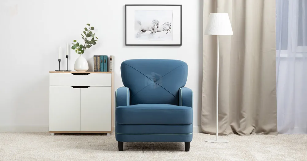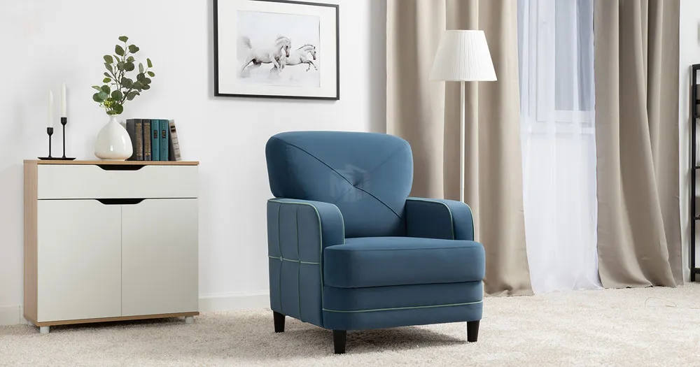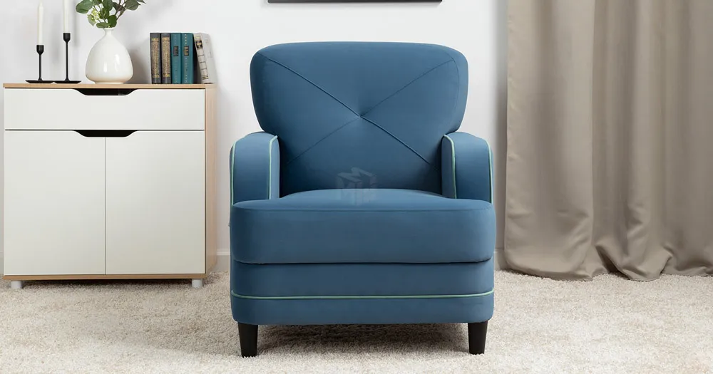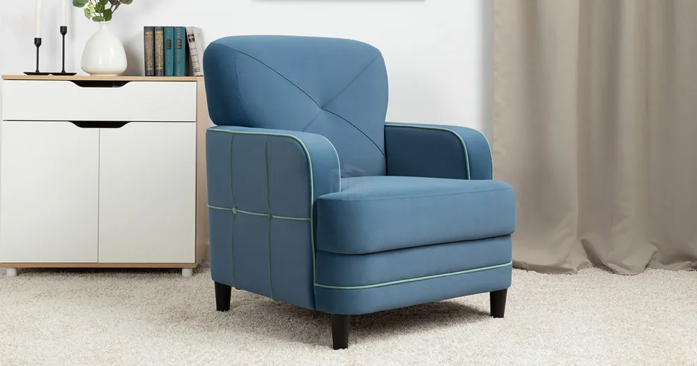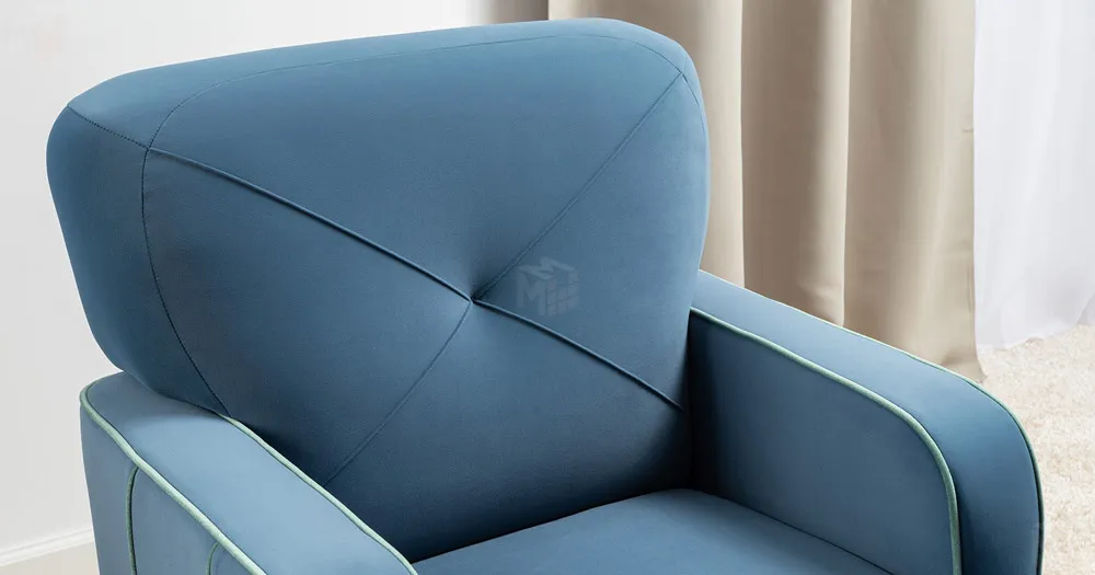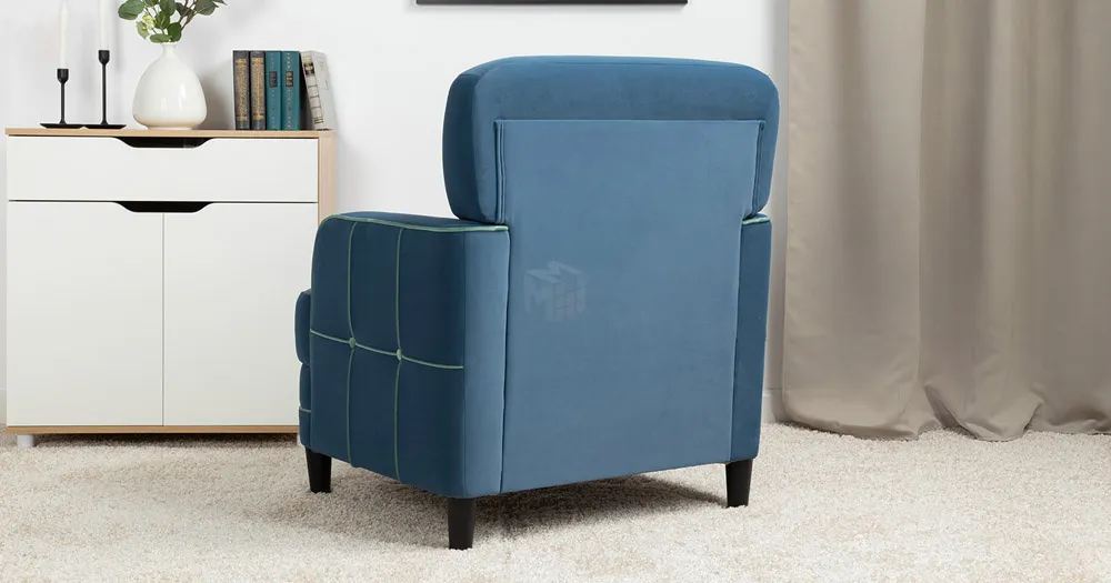Декоративные канты на вставке подлокотников. Пуговицы в местах пересечения кантов на подушке и вставке подлокотников. По торцам подлокотников и думках контрастный декоративный кант. Защипы на сиденье и подушке.