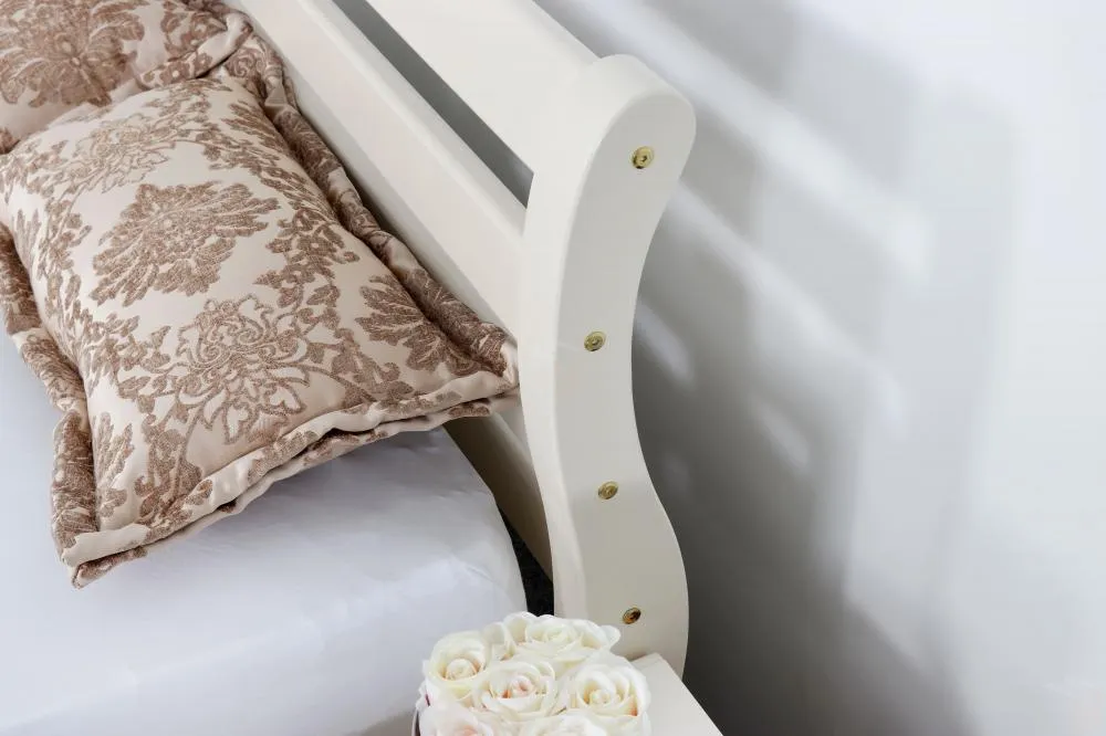 Кровать покрыта однокомпонентной водоразбавляемой акриловой эмалью, обладающей высокой износостойкостью. Матрасное основание входит в комплект кровати: изготовлено из 7 брусков и настила ХДФ.