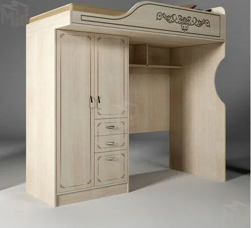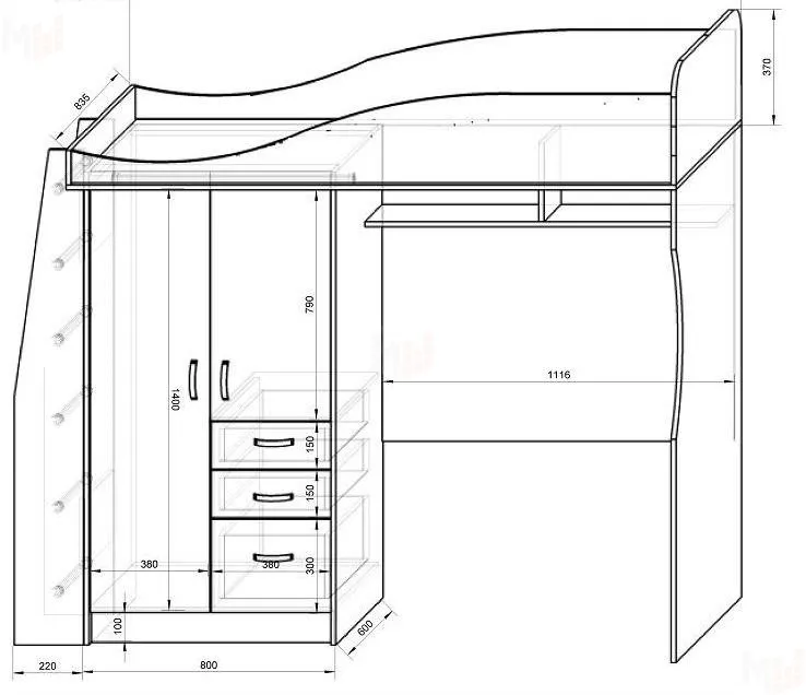 Модель имеет достаточно большое спальное место и в основании спального ложа расположен лист ДСП. Моноблок включает в себя встроенный шкаф с комбинированным наполнением, которое состоит из металлической штанги и полок, а также выдвижных ящиков и узкой лестницы.