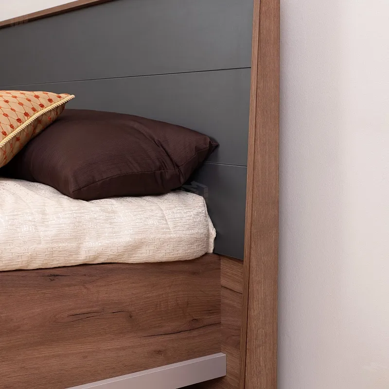 Эффектная двуспальная кровать коллекции КАРА с объемным сборным изголовьем в декоре Антрацит – элегантная модель, которая прекрасно впишется в любой интерьер и станет его визуальной доминантой. Декоративная накладная планка в цвете Велюр по периметру кровати подчеркивает фактурные теплые древесные полутона Дуба Табачного.