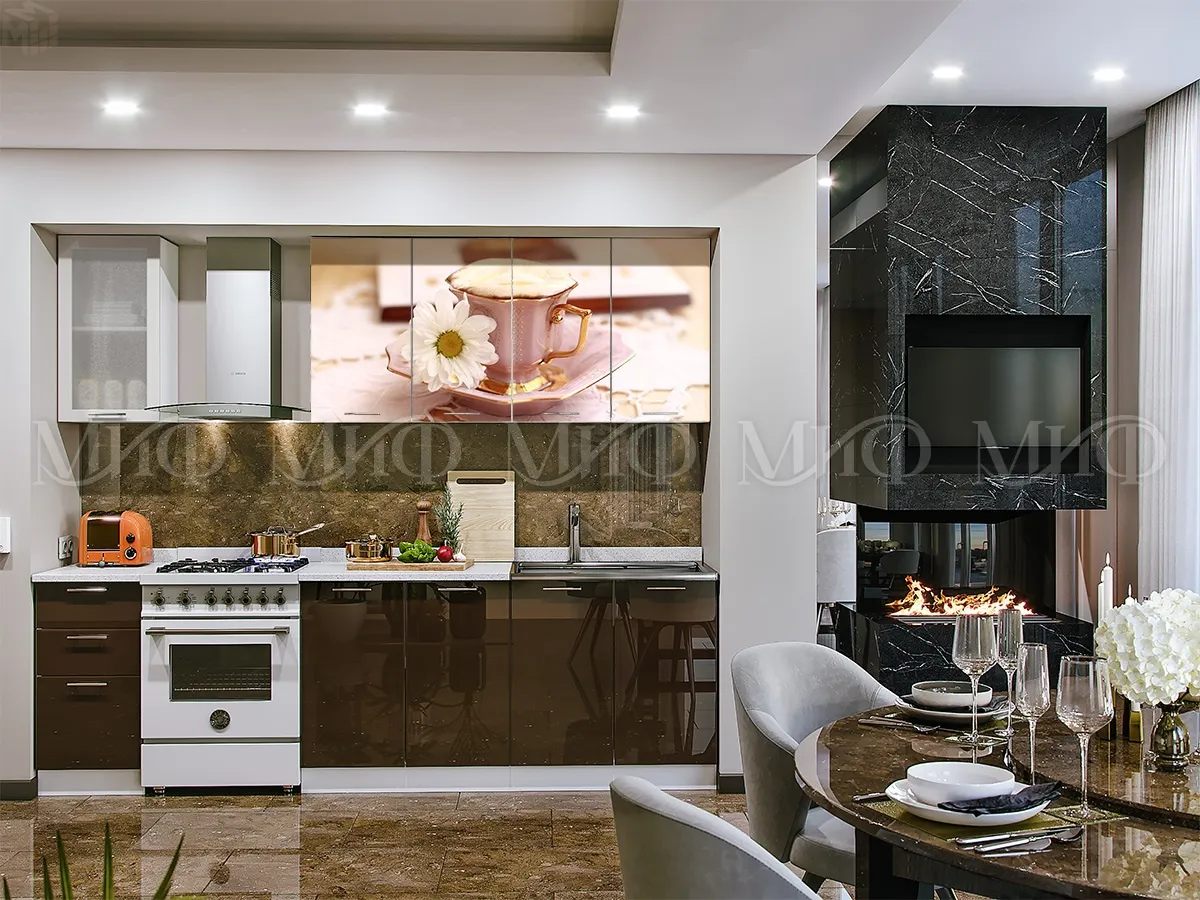 Материал: ЛДСП белого цвета, фасады МДФ белый глянец с фотопечатью, низ шоколад глянец.