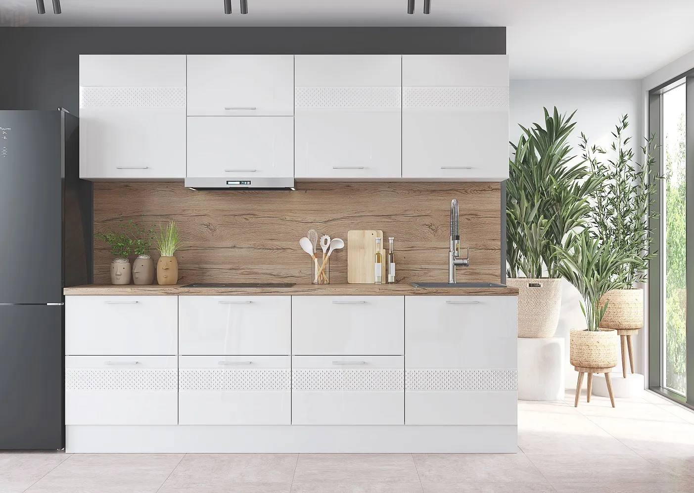 Корпус кухни выполнен из ЛДСП белого цвета, фасады МДФ белый глянец (на фото).