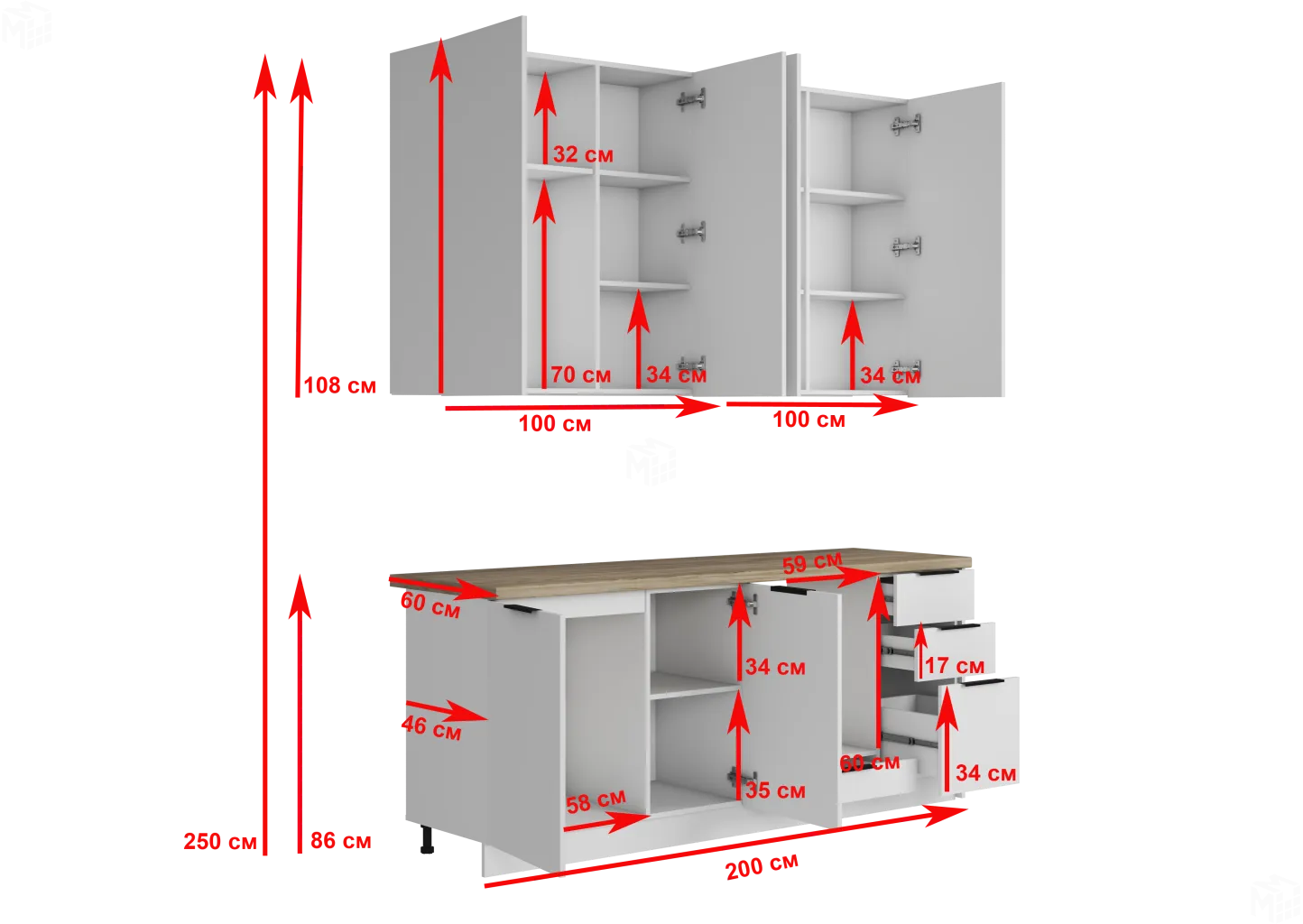 Открывание верхних шкафов осуществляется путём захвата за счёт увеличенных по высоте фасадов относительно самого корпуса.