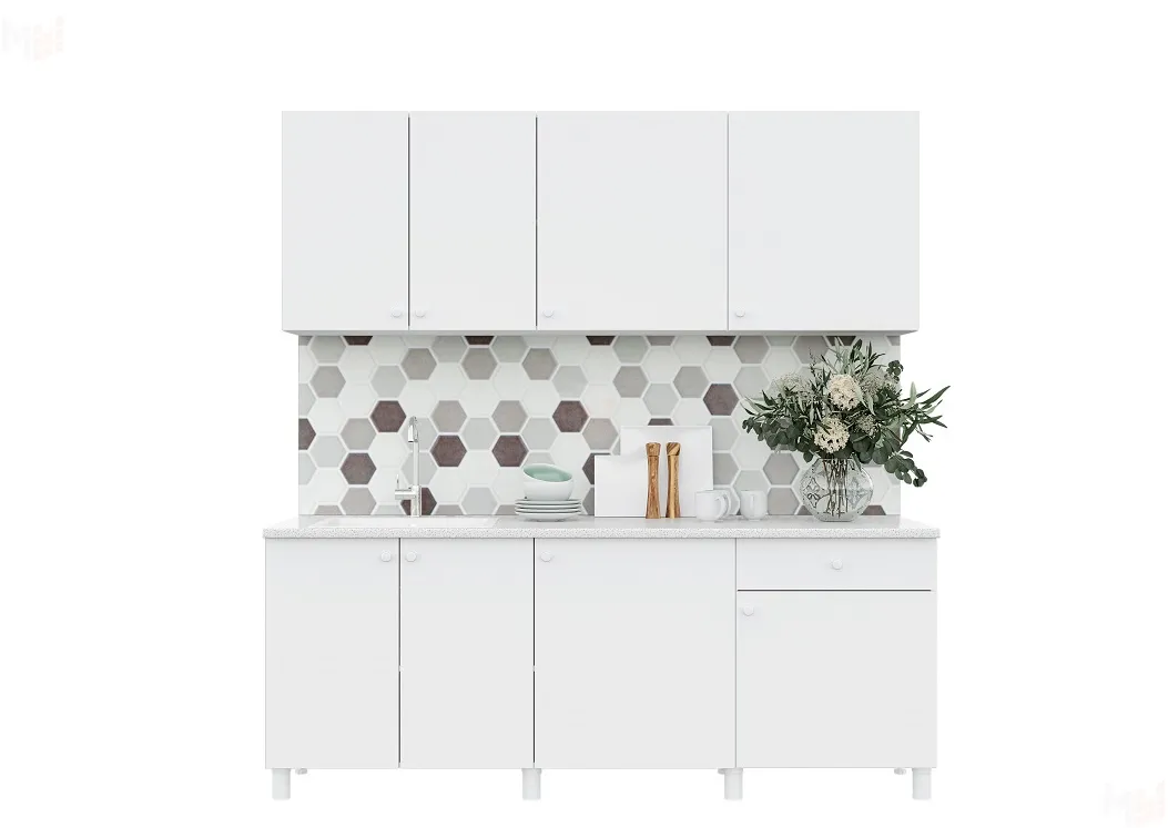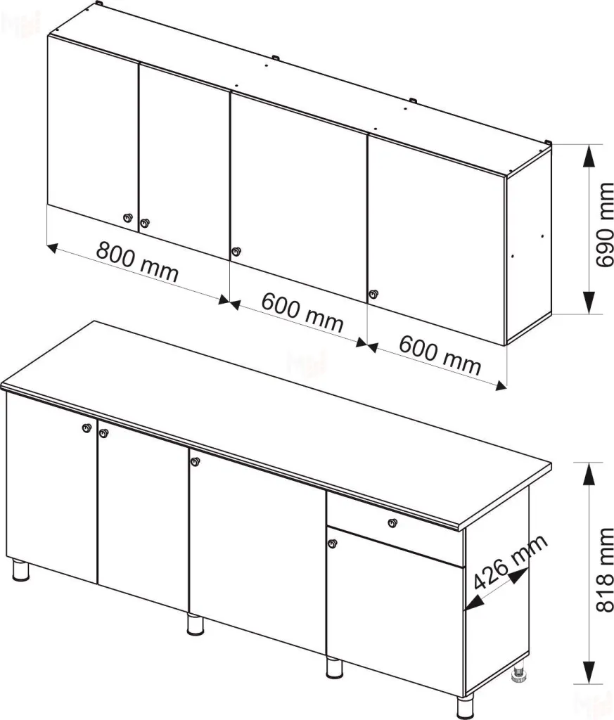 Кухонный гарнитур состоит из стола шириной 2000 мм, он поделен на 3 части - шириной 80 см с двумя дверками, стол 60 и стол 60см с ящиком и дверью. В гарнитур также входит верхний шкаф общей шириной 2000 мм, разделен на три отделения 80, 60 и 60 см.