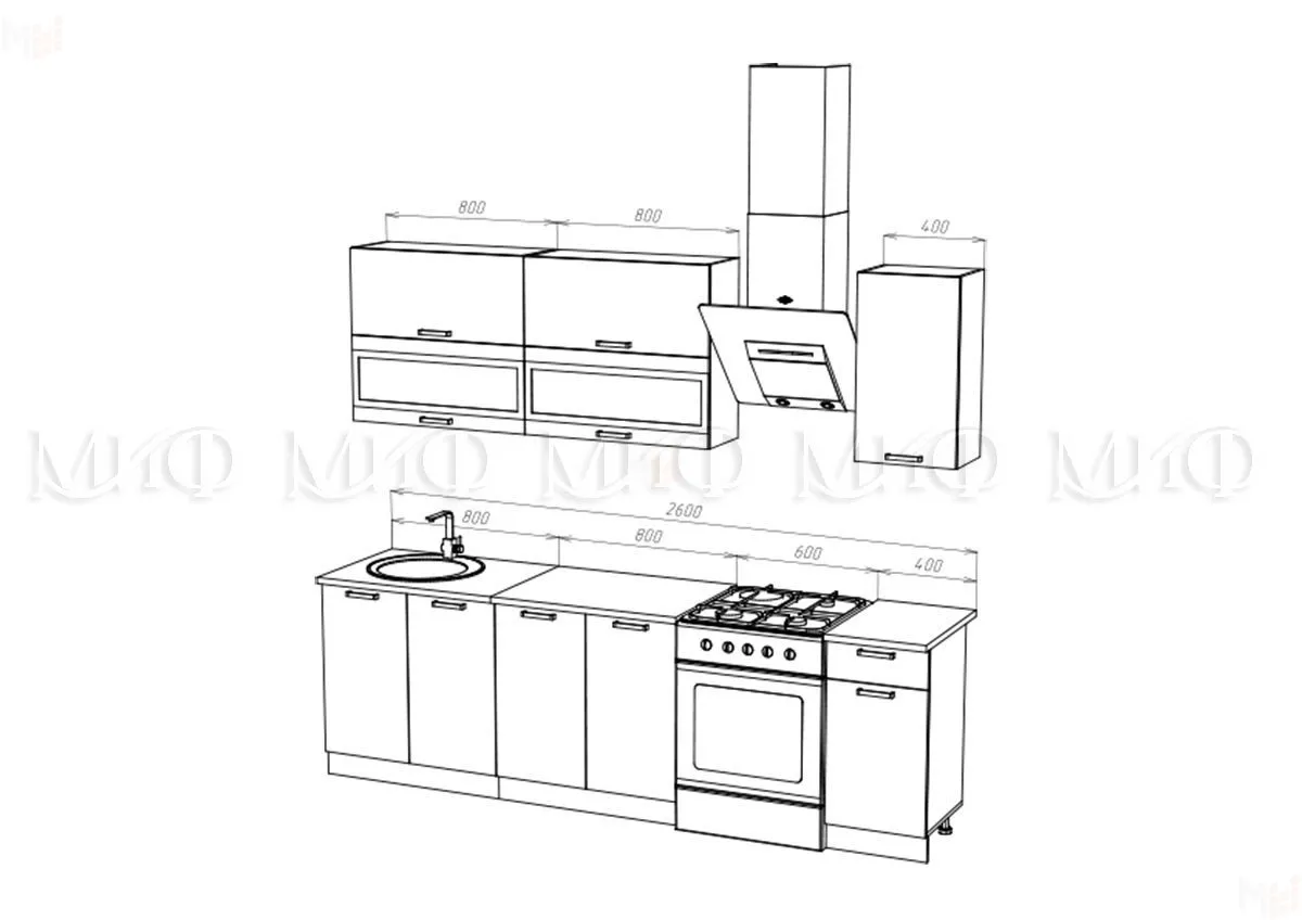 Глубина нижних столов по столешнице 600 мм. В стоимость гарнитура входят столешницы 800 и 400 мм.