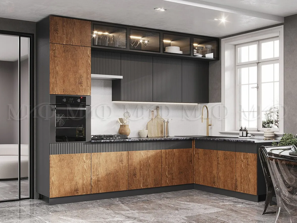 Кухонный гарнитур Оливия угловая 3,0*1,8 (Экзотическое дерево Амазония/Графит софт)