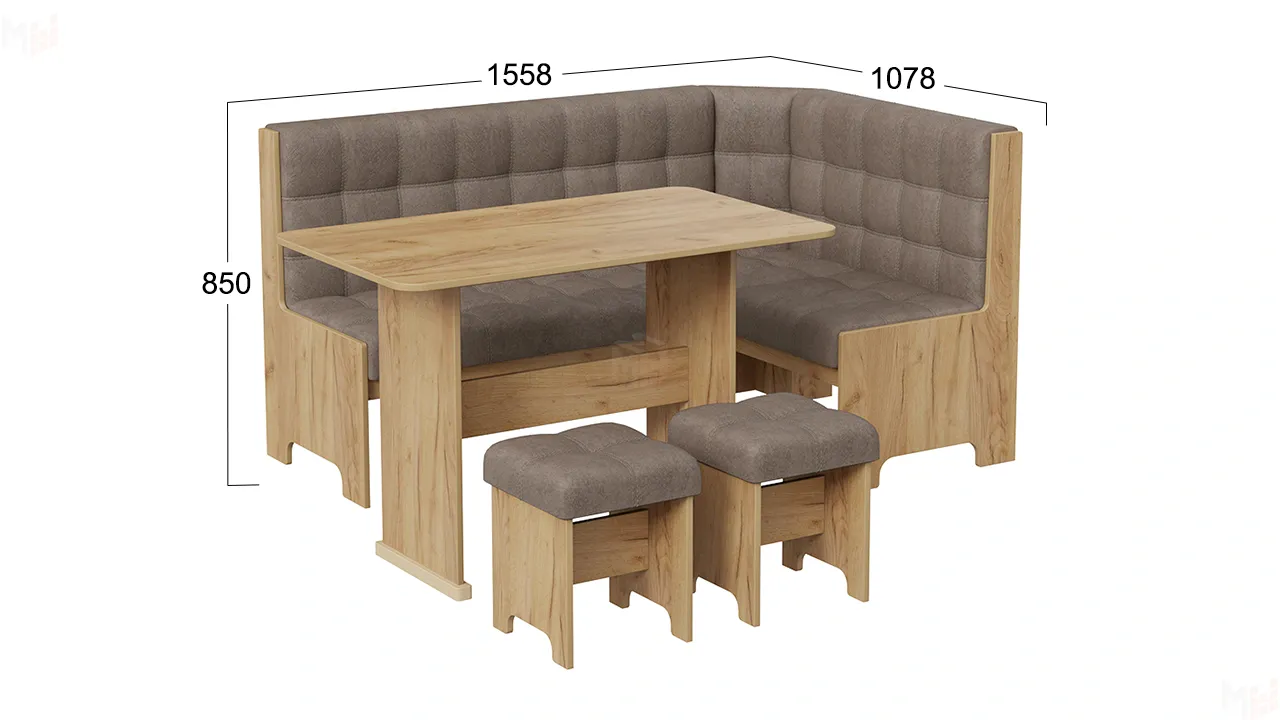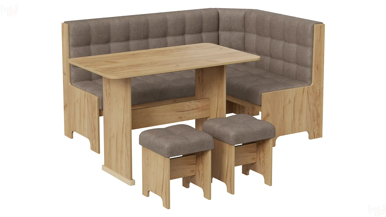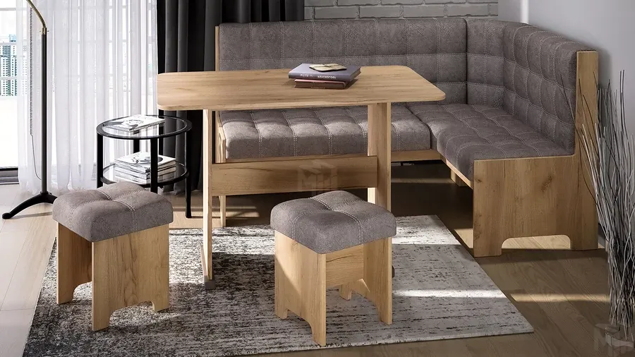 В состав входят: стол, угловая скамья и два табурета