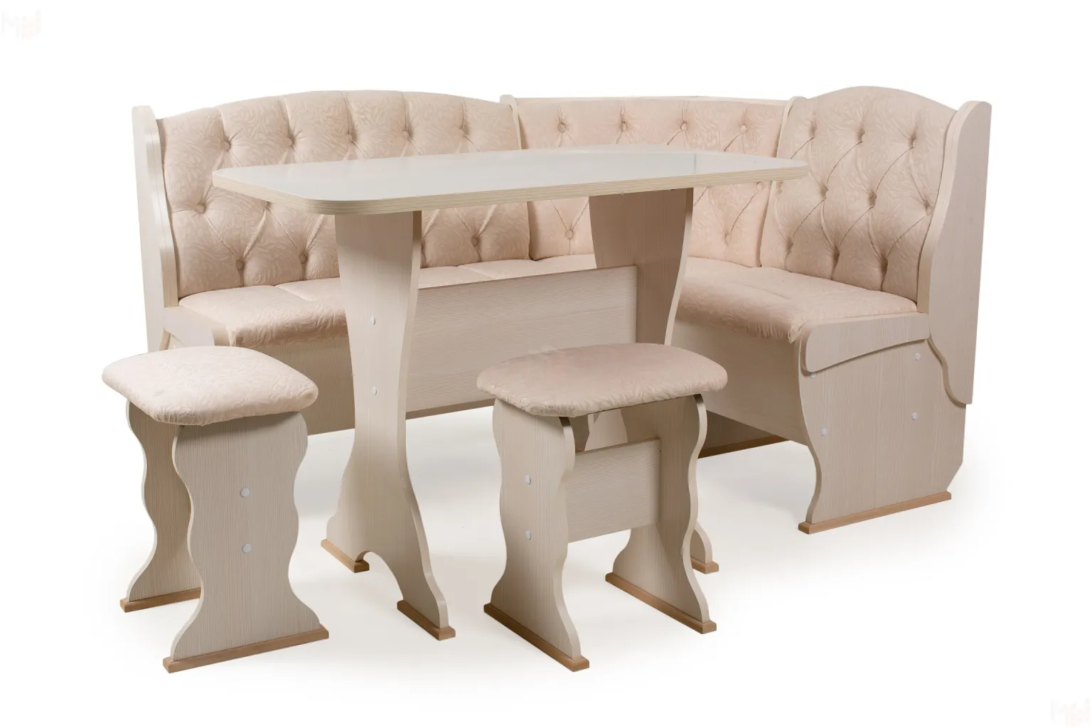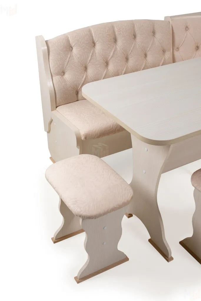 Кухонный уголок с двумя ящиками для хранения. Каркас из ЛДСП бодега, обивка флок карамель. Покрытие столешницы термостойкий пластик. Современная и функциональная модель.