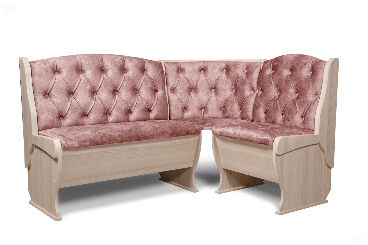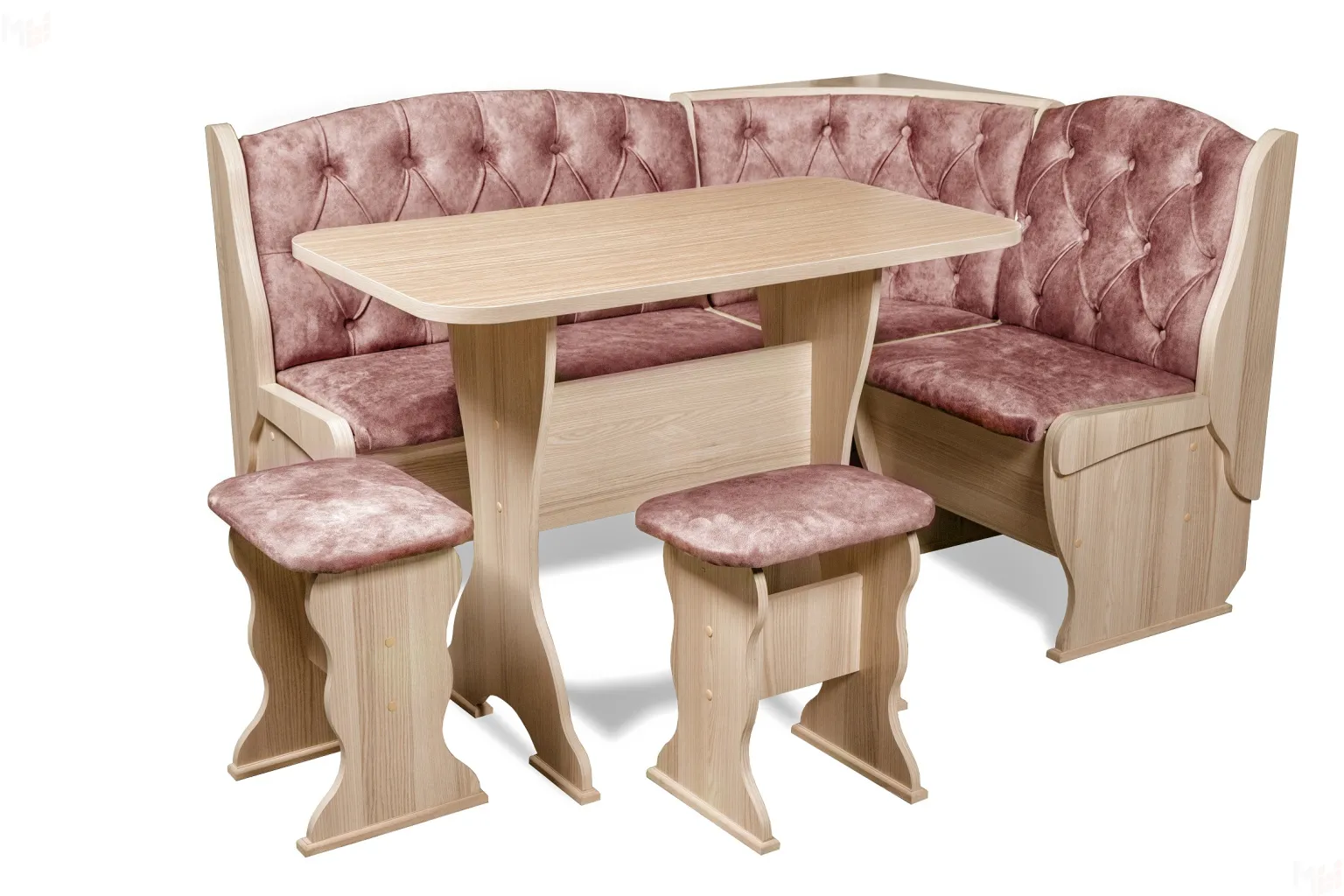 Кухонный уголок с двумя ящиками для хранения. Каркас из ЛДСП ясень, обивка велюр цвета Коралл. Покрытие столешницы термостойкий пластик. Современная и функциональная модель.