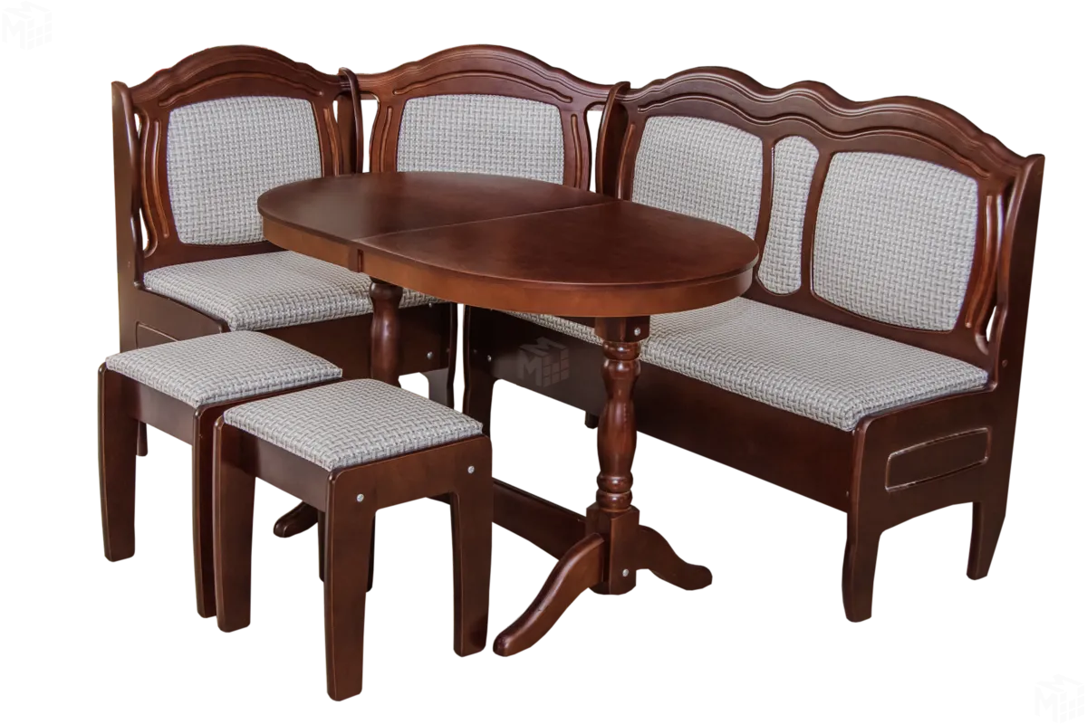 Столешница стола изготовлена из шпона березы, а ножки стола, табуретки и каркас уголка произведены из соснового массива. Данный привлекательный мебельный комплект можно удачно разместить даже на небольшом кухонном пространстве. Приятные классические цвета изделия наверняка придутся по душе многим покупателям, желающим приобрести качественный и практичный кухонный гарнитур. В случае необходимости столешницу можно разложить, а угол расположить на любую сторону.