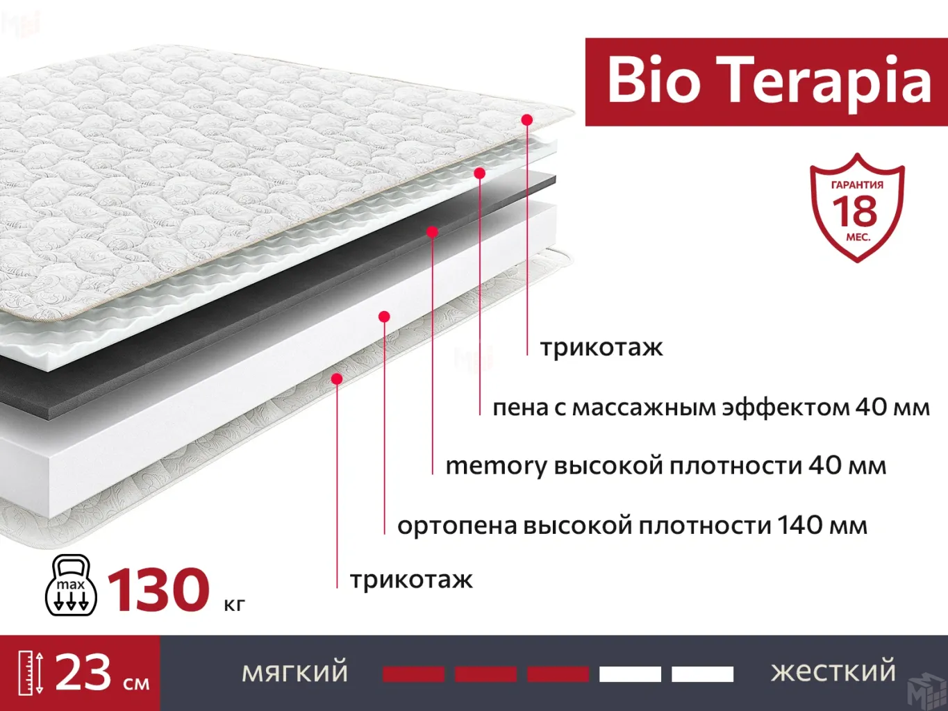 Матрас Bio Terapia с анатомической пеной, которая обладает микромассажным эффектом. Плотная рельефная пена в составе матраса нормализует кровообращение, уменьшает физический дискомфорт после интенсивных нагрузок, поддерживает упругость мышц пока Вы спите.