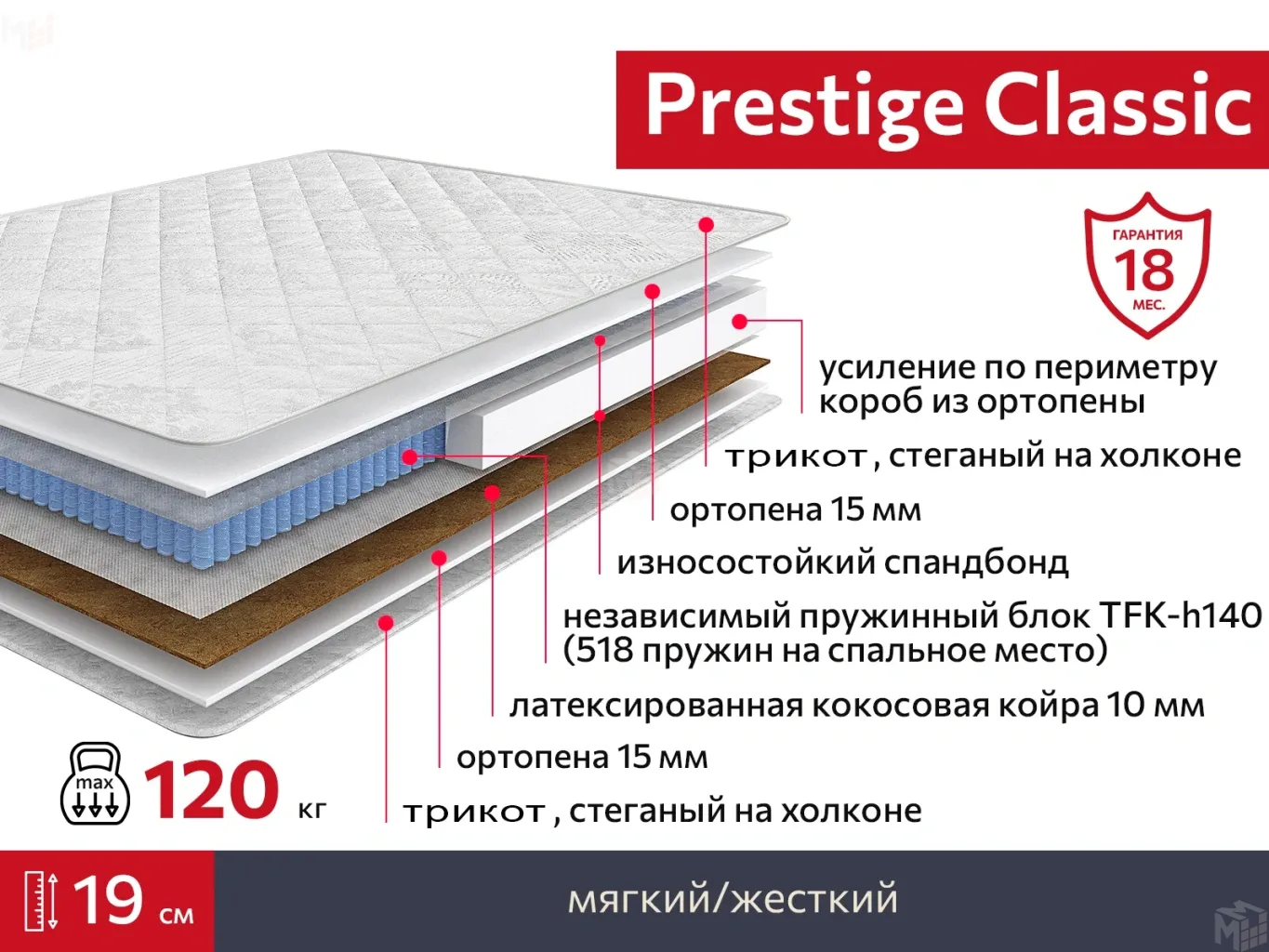 В основе двустороннего матраса Prestige Classic лежит блок независимых пружин. Каждая пружина работает индивидуально, что позволяет достичь максимального анатомического эффекта.