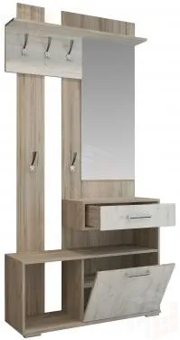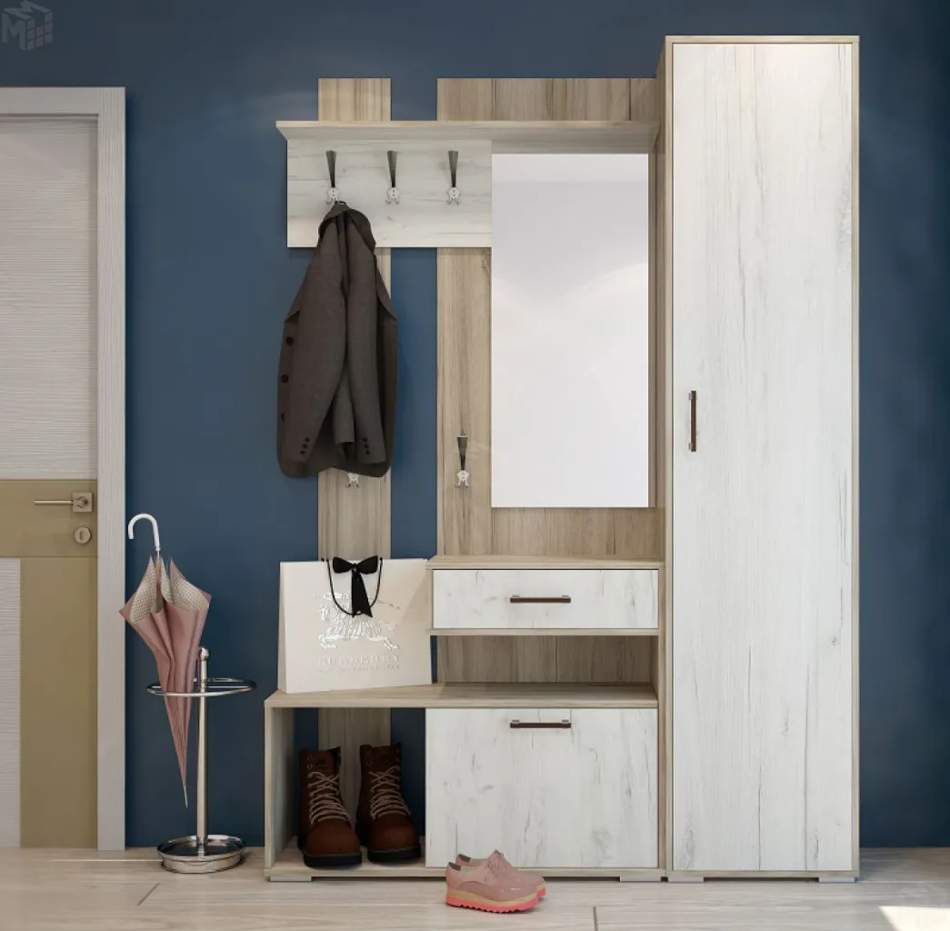 Прихожая Смарт - отличное решение для тех. кто ищет недорогую, но в то же время надёжную, вместительную, функциональную и симпатичную прихожую. В состав прихожей входит вешалка с крючками, зеркало, тумба для обуви, Выдвижной ящик.