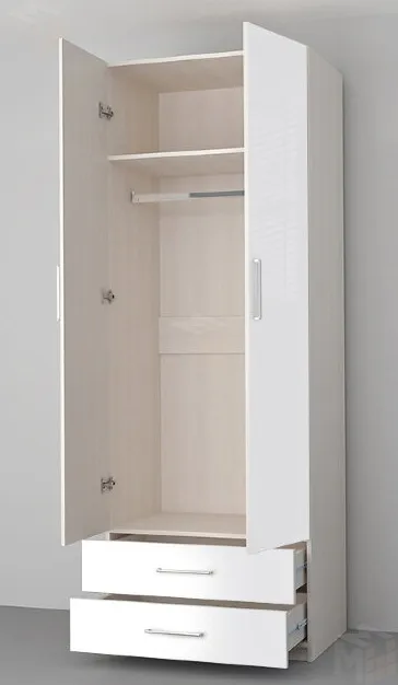 Шкаф оснащен двумя дверками и двумя выдвижными ящиками.