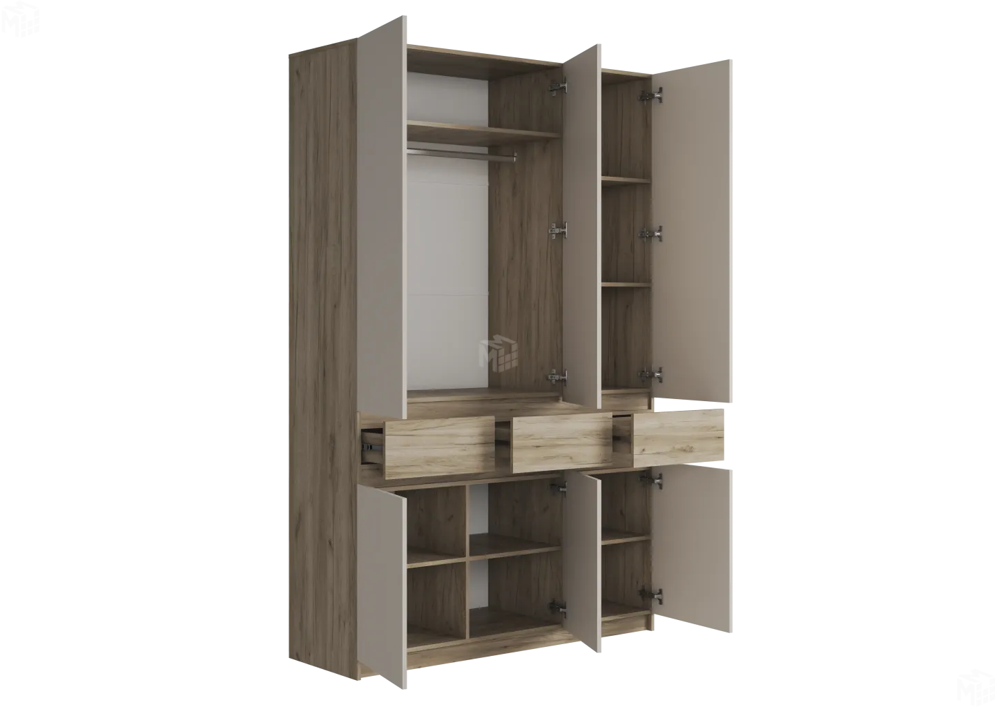 В нижней части шкафа перегородка по центру и 2 полки на равных расстояниях.