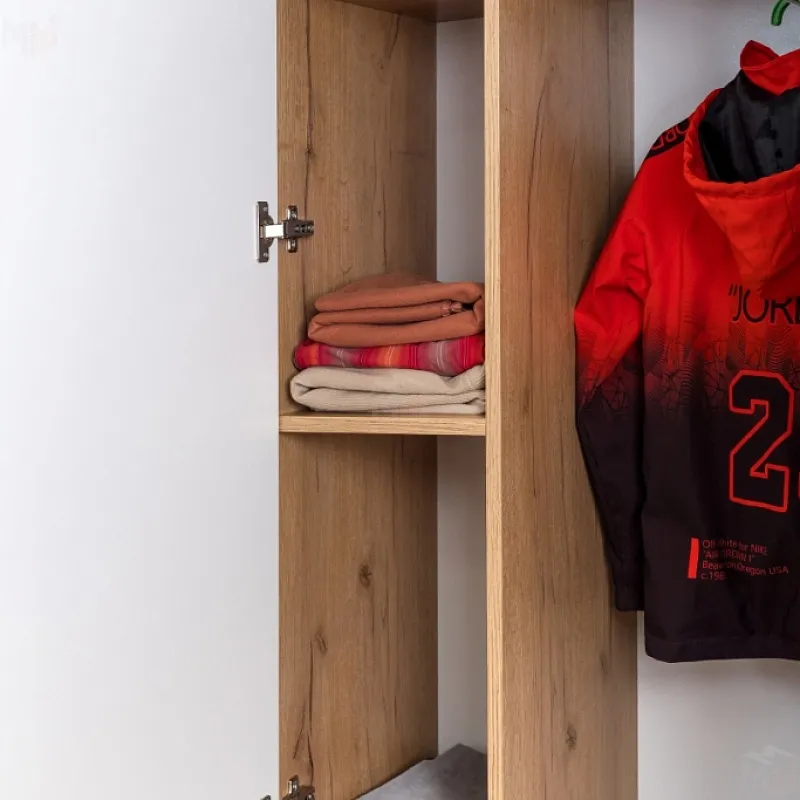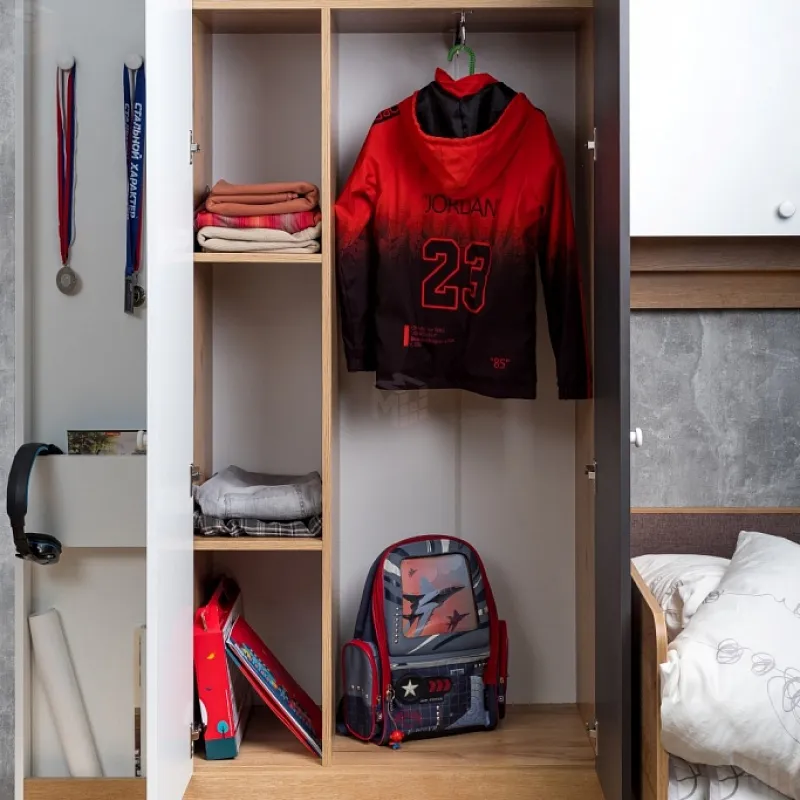 Наполнение 92 Шкафа для одежды и белья продумано до мелочей: выдвижные ящики, стеллаж для одежды и выдвижная штанга для плечиков – всё это помещается в одном модуле.