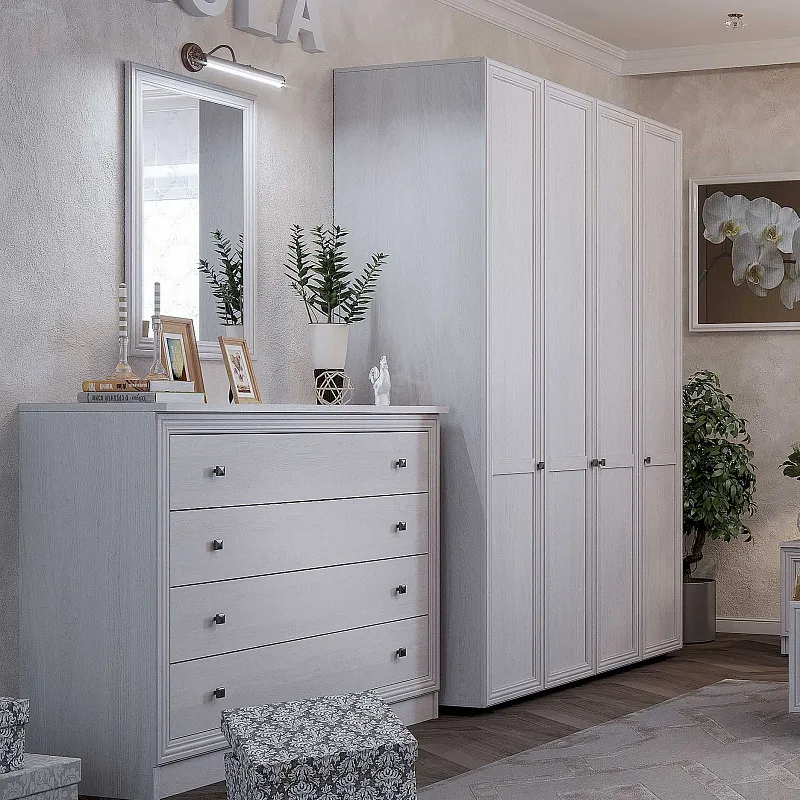 Большой и вместительный шкаф для одежды и белья отлично подойдет для многочисленной семьи. Внутри шкафа стационарная штанга (777 мм), которая выдержит нагрузку в 40 кг, а также полки, регулируемые по высоте. Рамочные фасады, обрамленные сложным профилем МДФ, создают атмосферу роскоши и изящества. Для надежности шкаф обязательно крепится к стене на подвесы. Регулируемые опоры позволят компенсировать незначительные неровности пола.