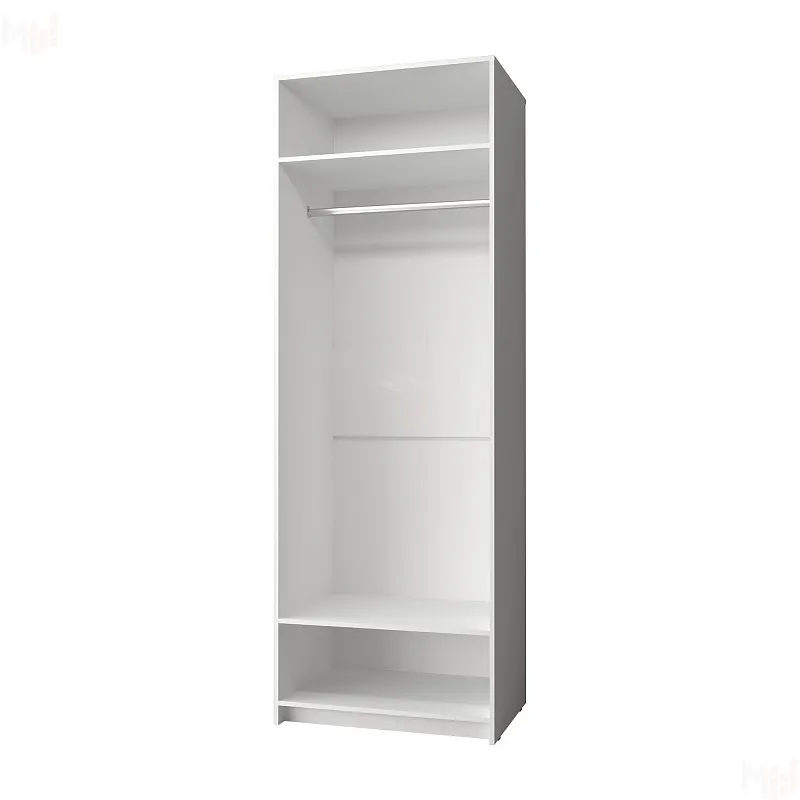 Распашной шкаф для одежды разделяется на отдельно продающиеся элементы: корпус и фасады - Зеркало и Стандарт. В этом варианте корпус совмещается с двумя фасадами Зеркало. Зеркальная дверь, обрамленная профилем МДФ, в полный рост наполнит ощущением света и простора даже маленькую по габаритам спальню.