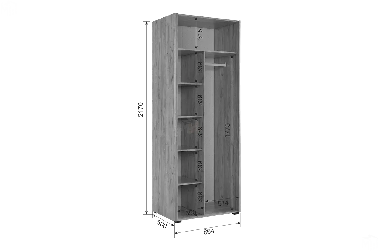 ширина 864 мм, глубина 500 мм, высота 2170 мм