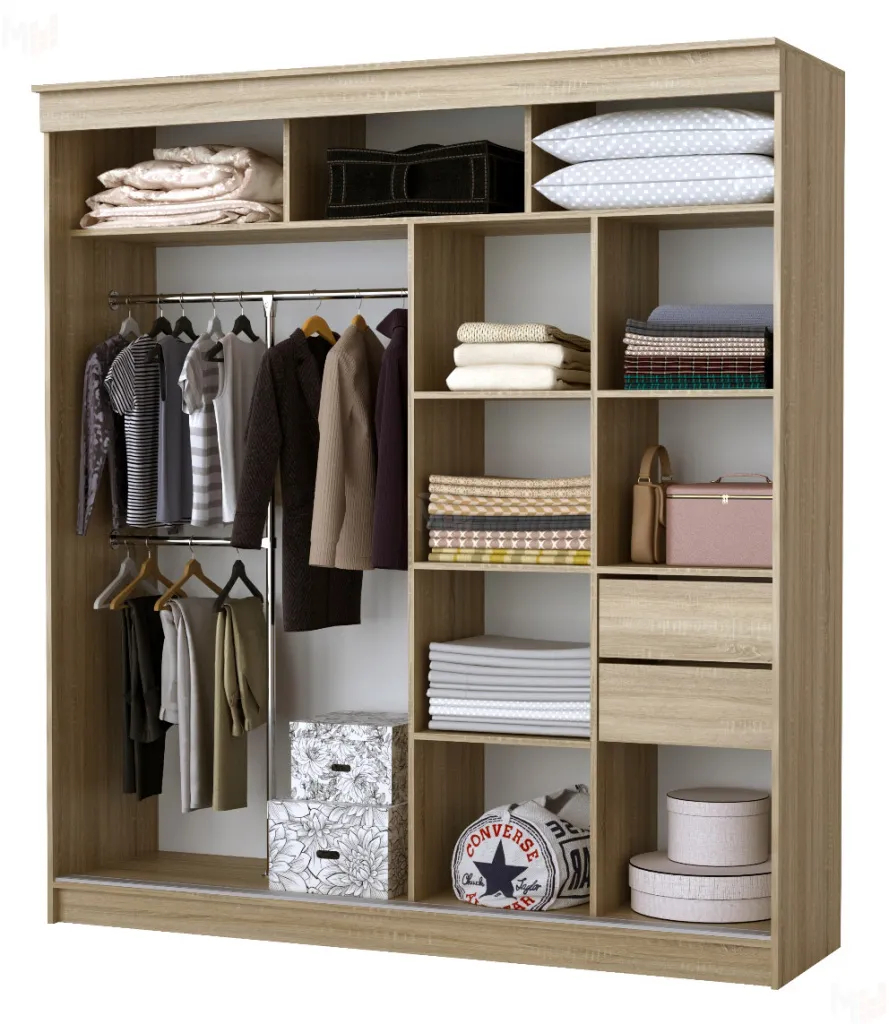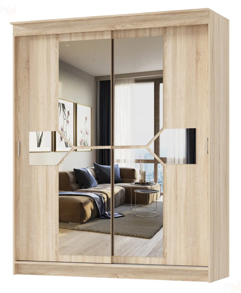 Шкаф-купе АЛЬЯНС двухстворчатый с зеркалами ФАВОРИТ на алюминиевых направляющих, размерным рядом по ширине 1,5 м, 1,8 м и 2,0 м, с полками, металлической штангой штангой для верхней одежды и двумя ящиками на роликовых направляющих. Так же Покупатель может заказать шкаф-купе с зеркалами "БАБОЧКА" или "ОРИОН".