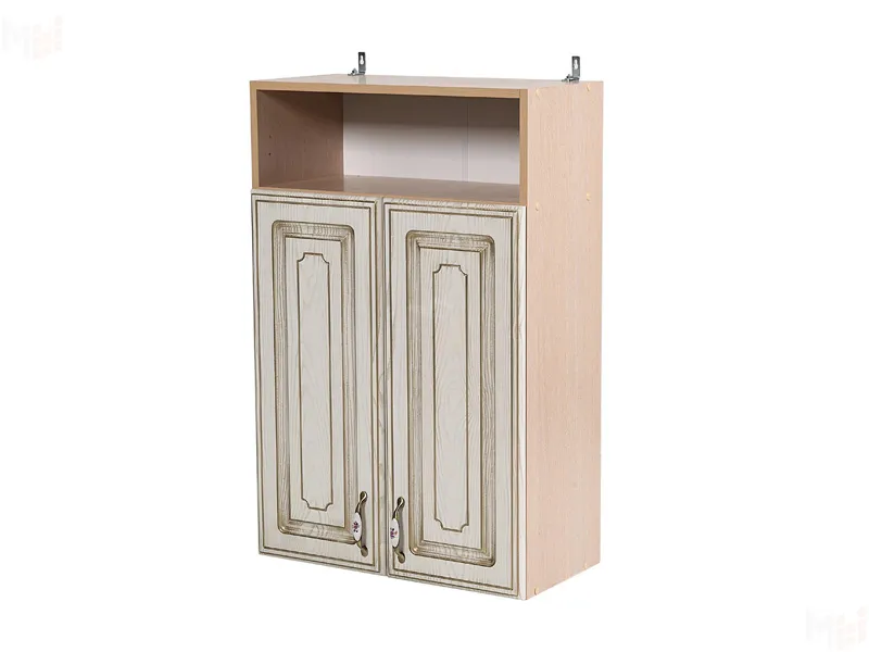 Шкафчик навесной шириной на 600 мм с полочной нишей украшенной балюстрадой. Две распашные глухие дверцы, две внутренние полочки. -