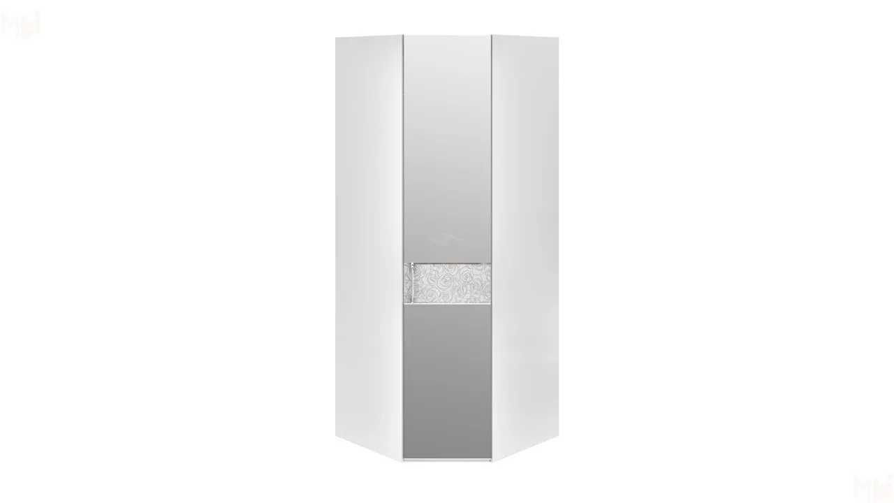 Благодаря угловой конструкции и единому для коллекции «Амели» дизайну этот вместительный шкаф может стать значимым элементом спального гарнитура, составленного из входящих в серию модульной мебели для спален элементов — кровати, прямых шкафов, прикроватных тумб, комода. Створку модели украшает ростовое зеркало, которое существенно расширяет функциональность меблировки.